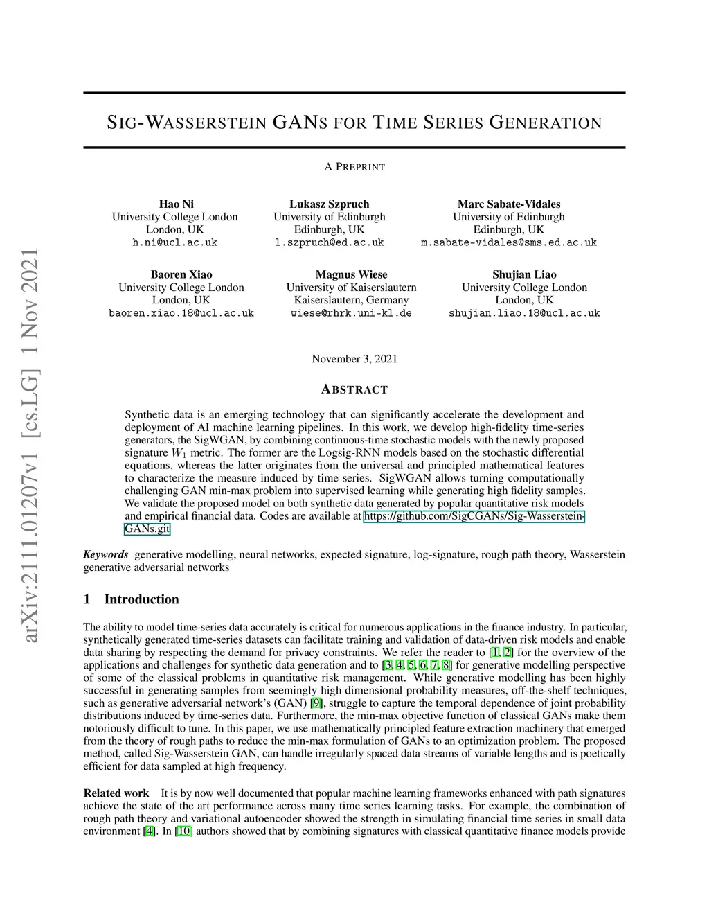 Synthetic data is an emerging technology that can significantly accelerate the development and deployment of AI machine learning pipelines. In this work, we develop high-fidelity time-series generators, the SigWGAN, by combining continuous-time stochastic models with the newly proposed signature metric. The former are the Logsig-RNN models based on the stochastic differential equations, whereas the latter originates from the universal and principled mathematical features to characterize the measure induced by time series. SigWGAN allows turning computationally challenging GAN min-max problem into supervised learning while generating high fidelity samples. We validate the proposed model on both synthetic data generated by popular quantitative risk models and empirical financial data. Codes are available at https://github.com/SigCGANs/Sig-Wasserstein-GANs.git.