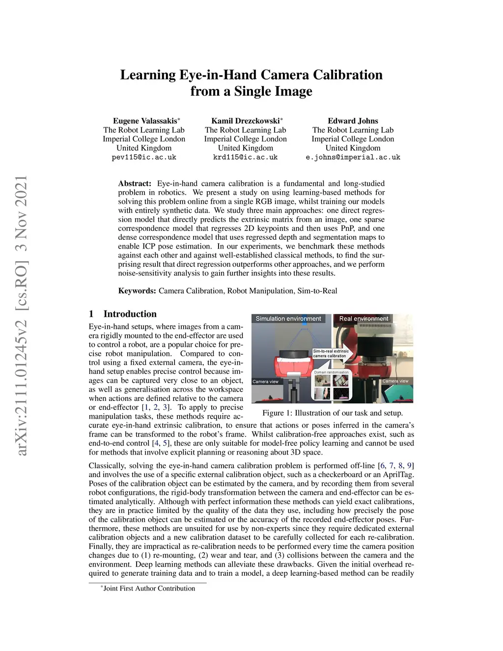 Learning Eye-in-Hand Camera Calibration from a Single Image