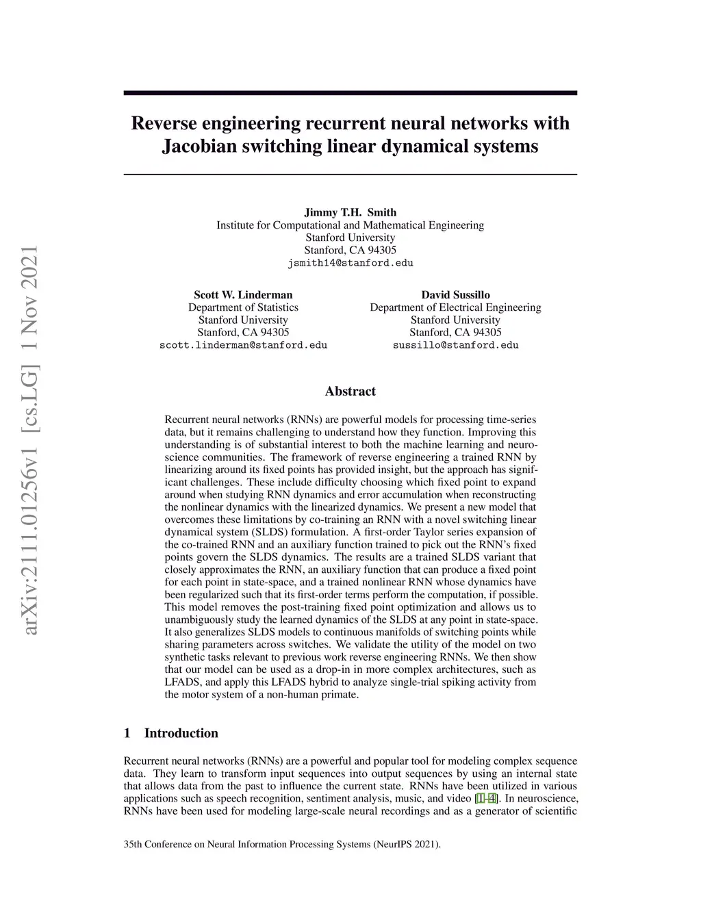 Recurrent neural networks (RNNs) are powerful models for processing time-series data, but it remains challenging to understand how they function. Improving this understanding is of substantial interest to both the machine learning and neuroscience communities. The framework of reverse engineering a trained RNN by linearizing around its fixed points has provided insight, but the approach has significant challenges. These include difficulty choosing which fixed point to expand around when studying RNN dynamics and error accumulation when reconstructing the nonlinear dynamics with the linearized dynamics. We present a new model that overcomes these limitations by co-training an RNN with a novel switching linear dynamical system (SLDS) formulation. A first-order Taylor series expansion of the co-trained RNN and an auxiliary function trained to pick out the RNN's fixed points govern the SLDS dynamics. The results are a trained SLDS variant that closely approximates the RNN, an auxiliary function that can produce a fixed point for each point in state-space, and a trained nonlinear RNN whose dynamics have been regularized such that its first-order terms perform the computation, if possible. This model removes the post-training fixed point optimization and allows us to unambiguously study the learned dynamics of the SLDS at any point in state-space. It also generalizes SLDS models to continuous manifolds of switching points while sharing parameters across switches. We validate the utility of the model on two synthetic tasks relevant to previous work reverse engineering RNNs. We then show that our model can be used as a drop-in in more complex architectures, such as LFADS, and apply this LFADS hybrid to analyze single-trial spiking activity from the motor system of a non-human primate.