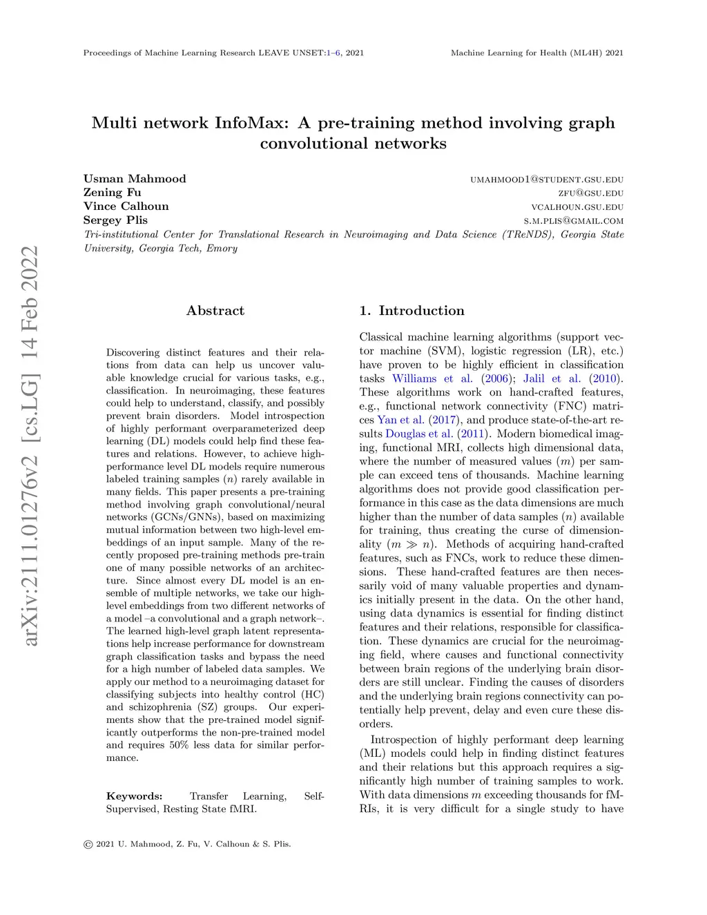 Discovering distinct features and their relations from data can help us uncover valuable knowledge crucial for various tasks, e.g., classification. In neuroimaging, these features could help to understand, classify, and possibly prevent brain disorders. Model introspection of highly performant overparameterized deep learning (DL) models could help find these features and relations. However, to achieve high-performance level DL models require numerous labeled training samples () rarely available in many fields. This paper presents a pre-training method involving graph convolutional/neural networks (GCNs/GNNs), based on maximizing mutual information between two high-level embeddings of an input sample. Many of the recently proposed pre-training methods pre-train one of many possible networks of an architecture. Since almost every DL model is an ensemble of multiple networks, we take our high-level embeddings from two different networks of a model --a convolutional and a graph network--. The learned high-level graph latent representations help increase performance for downstream graph classification tasks and bypass the need for a high number of labeled data samples. We apply our method to a neuroimaging dataset for classifying subjects into healthy control (HC) and schizophrenia (SZ) groups. Our experiments show that the pre-trained model significantly outperforms the non-pre-trained model and requires less data for similar performance.