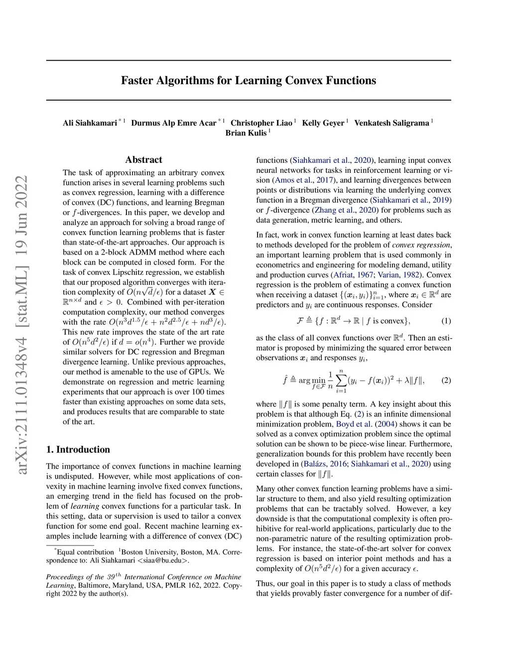 The task of approximating an arbitrary convex function arises in several learning problems such as convex regression, learning with a difference of convex (DC) functions, and learning Bregman or -divergences. In this paper, we develop and analyze an approach for solving a broad range of convex function learning problems that is faster than state-of-the-art approaches. Our approach is based on a 2-block ADMM method where each block can be computed in closed form. For the task of convex Lipschitz regression, we establish that our proposed algorithm converges with iteration complexity of $ O(n\sqrt{d}/\epsilon)$ for a dataset and . Combined with per-iteration computation complexity, our method converges with the rate . This new rate improves the state of the art rate of if . Further we provide similar solvers for DC regression and Bregman divergence learning. Unlike previous approaches, our method is amenable to the use of GPUs. We demonstrate on regression and metric learning experiments that our approach is over 100 times faster than existing approaches on some data sets, and produces results that are comparable to state of the art.