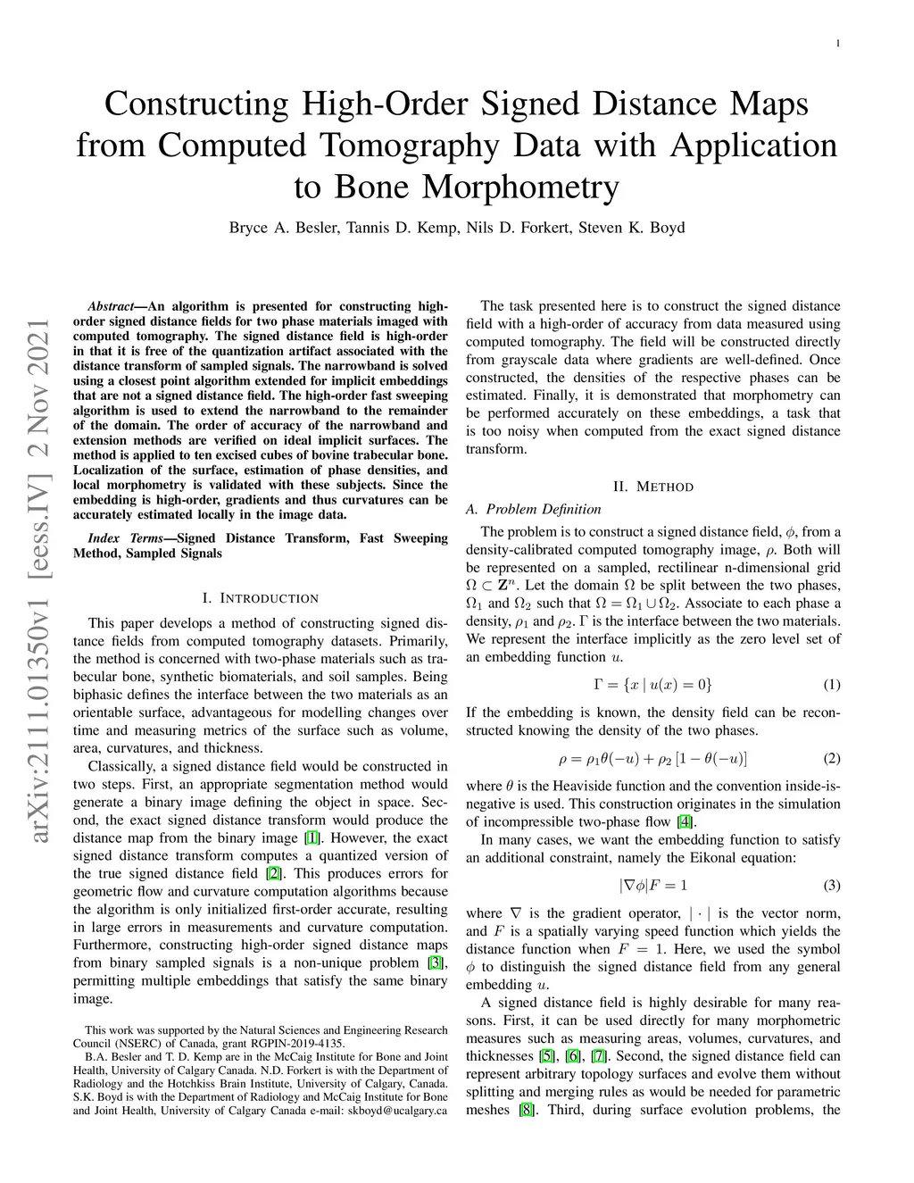 An algorithm is presented for constructing high-order signed distance fields for two phase materials imaged with computed tomography. The signed distance field is high-order in that it is free of the quantization artifact associated with the distance transform of sampled signals. The narrowband is solved using a closest point algorithm extended for implicit embeddings that are not a signed distance field. The high-order fast sweeping algorithm is used to extend the narrowband to the remainder of the domain. The order of accuracy of the narrowband and extension methods are verified on ideal implicit surfaces. The method is applied to ten excised cubes of bovine trabecular bone. Localization of the surface, estimation of phase densities, and local morphometry is validated with these subjects. Since the embedding is high-order, gradients and thus curvatures can be accurately estimated locally in the image data.