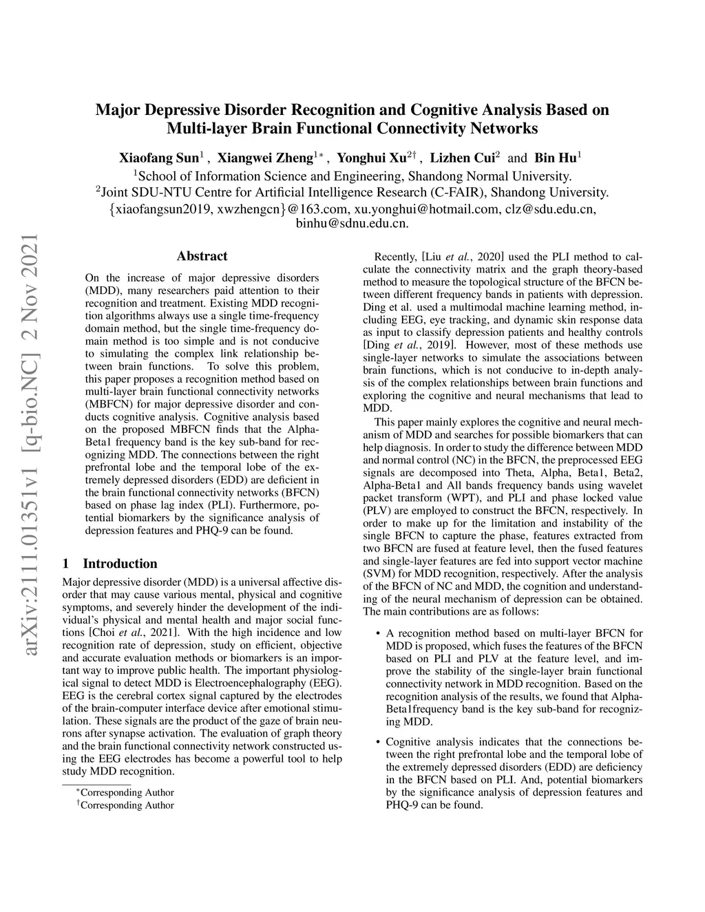 Major Depressive Disorder Recognition and Cognitive Analysis Based on