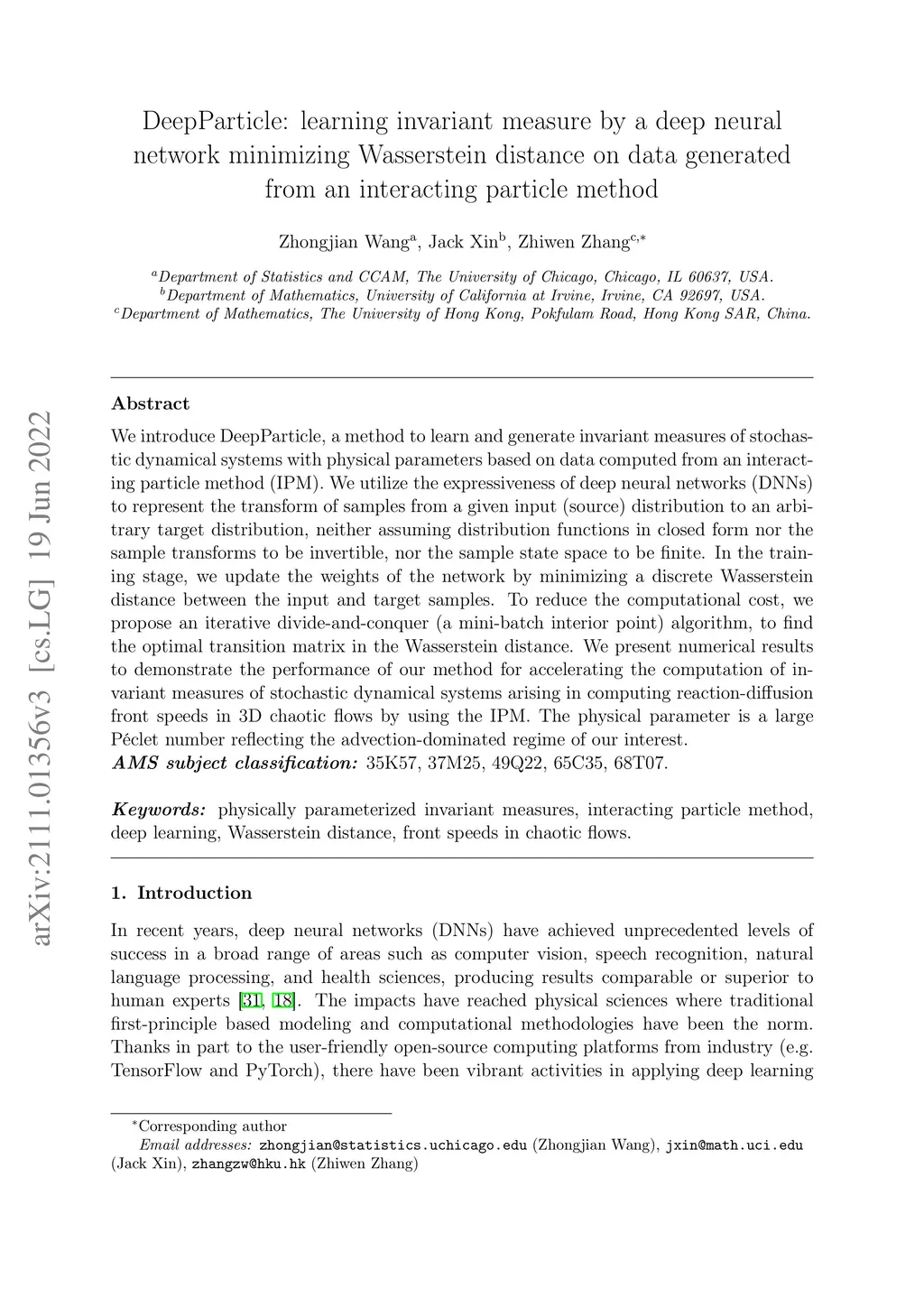 We introduce the so called DeepParticle method to learn and generate invariant measures of stochastic dynamical systems with physical parameters based on data computed from an interacting particle method (IPM). We utilize the expressiveness of deep neural networks (DNNs) to represent the transform of samples from a given input (source) distribution to an arbitrary target distribution, neither assuming distribution functions in closed form nor a finite state space for the samples. In training, we update the network weights to minimize a discrete Wasserstein distance between the input and target samples. To reduce computational cost, we propose an iterative divide-and-conquer (a mini-batch interior point) algorithm, to find the optimal transition matrix in the Wasserstein distance. We present numerical results to demonstrate the performance of our method for accelerating IPM computation of invariant measures of stochastic dynamical systems arising in computing reaction-diffusion front speeds through chaotic flows. The physical parameter is a large Pecl\ét number reflecting the advection dominated regime of our interest.