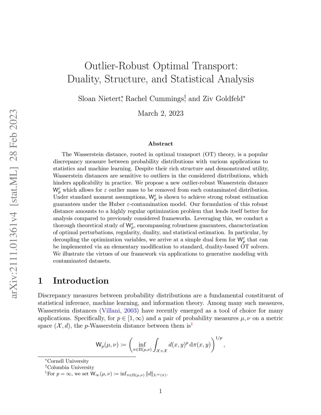 The Wasserstein distance, rooted in optimal transport (OT) theory, is a popular discrepancy measure between probability distributions with various applications to statistics and machine learning. Despite their rich structure and demonstrated utility, Wasserstein distances are sensitive to outliers in the considered distributions, which hinders applicability in practice. We propose a new outlier-robust Wasserstein distance which allows for outlier mass to be removed from each contaminated distribution. Under standard moment assumptions, is shown to achieve strong robust estimation guarantees under the Huber -contamination model. Our formulation of this robust distance amounts to a highly regular optimization problem that lends itself better for analysis compared to previously considered frameworks. Leveraging this, we conduct a thorough theoretical study of , encompassing robustness guarantees, characterization of optimal perturbations, regularity, duality, and statistical estimation. In particular, by decoupling the optimization variables, we arrive at a simple dual form for that can be implemented via an elementary modification to standard, duality-based OT solvers. We illustrate the virtues of our framework via applications to generative modeling with contaminated datasets.