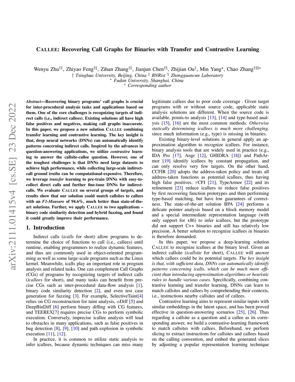 Recovering binary programs' call graphs is crucial for inter-procedural analysis tasks and applications based on them.transfer One of the core challenges is recognizing targets of indirect calls (i.e., indirect callees). Existing solutions all have high false positives and negatives, making call graphs inaccurate. In this paper, we propose a new solution Callee combining transfer learning and contrastive learning. The key insight is that, deep neural networks (DNNs) can automatically identify patterns concerning indirect calls, which can be more efficient than designing approximation algorithms or heuristic rules to handle various cases. Inspired by the advances in question-answering applications, we utilize contrastive learning to answer the callsite-callee question. However, one of the toughest challenges is that DNNs need large datasets to achieve high performance, while collecting large-scale indirect-call ground-truths can be computational-expensive. Since direct calls and indirect calls share similar calling conventions, it is possible to transfer knowledge learned from direct calls to indirect ones. Therefore, we leverage transfer learning to pre-train DNNs with easy-to-collect direct calls and further fine-tune the indirect-call DNNs. We evaluate Callee on several groups of targets, and results show that our solution could match callsites to callees with an F1-Measure of 94.6%, much better than state-of-the-art solutions. Further, we apply Callee to binary code similarity detection and hybrid fuzzing, and found it could greatly improve their performance.
