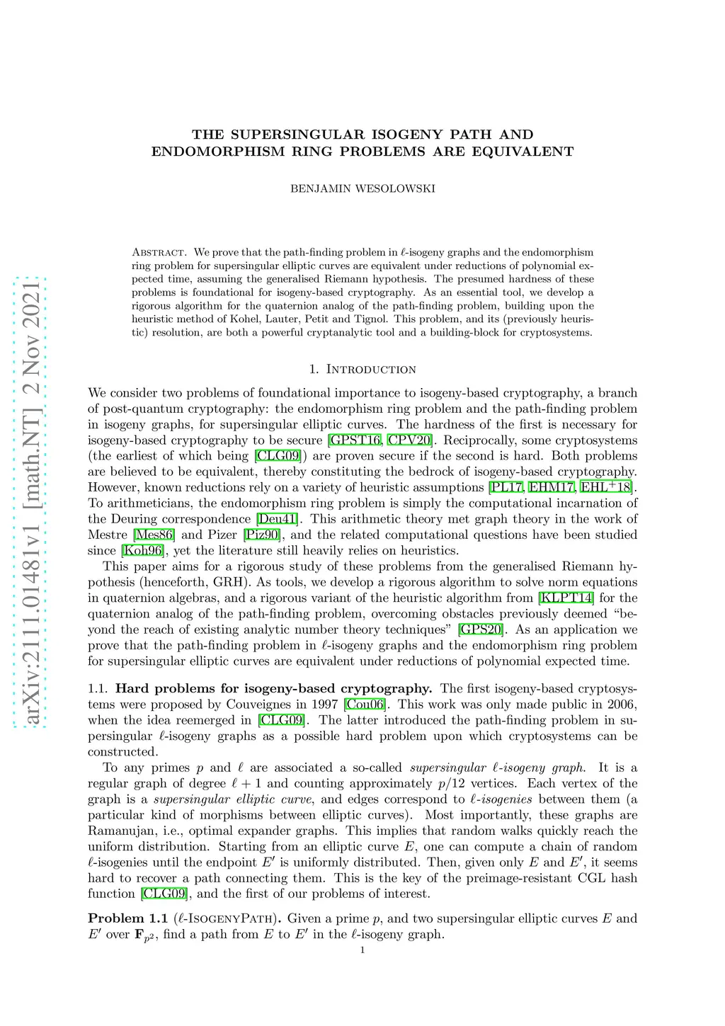 We prove that the path-finding problem in -isogeny graphs and the endomorphism ring problem for supersingular elliptic curves are equivalent under reductions of polynomial expected time, assuming the generalised Riemann hypothesis. The presumed hardness of these problems is foundational for isogeny-based cryptography. As an essential tool, we develop a rigorous algorithm for the quaternion analog of the path-finding problem, building upon the heuristic method of Kohel, Lauter, Petit and Tignol. This problem, and its (previously heuristic) resolution, are both a powerful cryptanalytic tool and a building-block for cryptosystems.