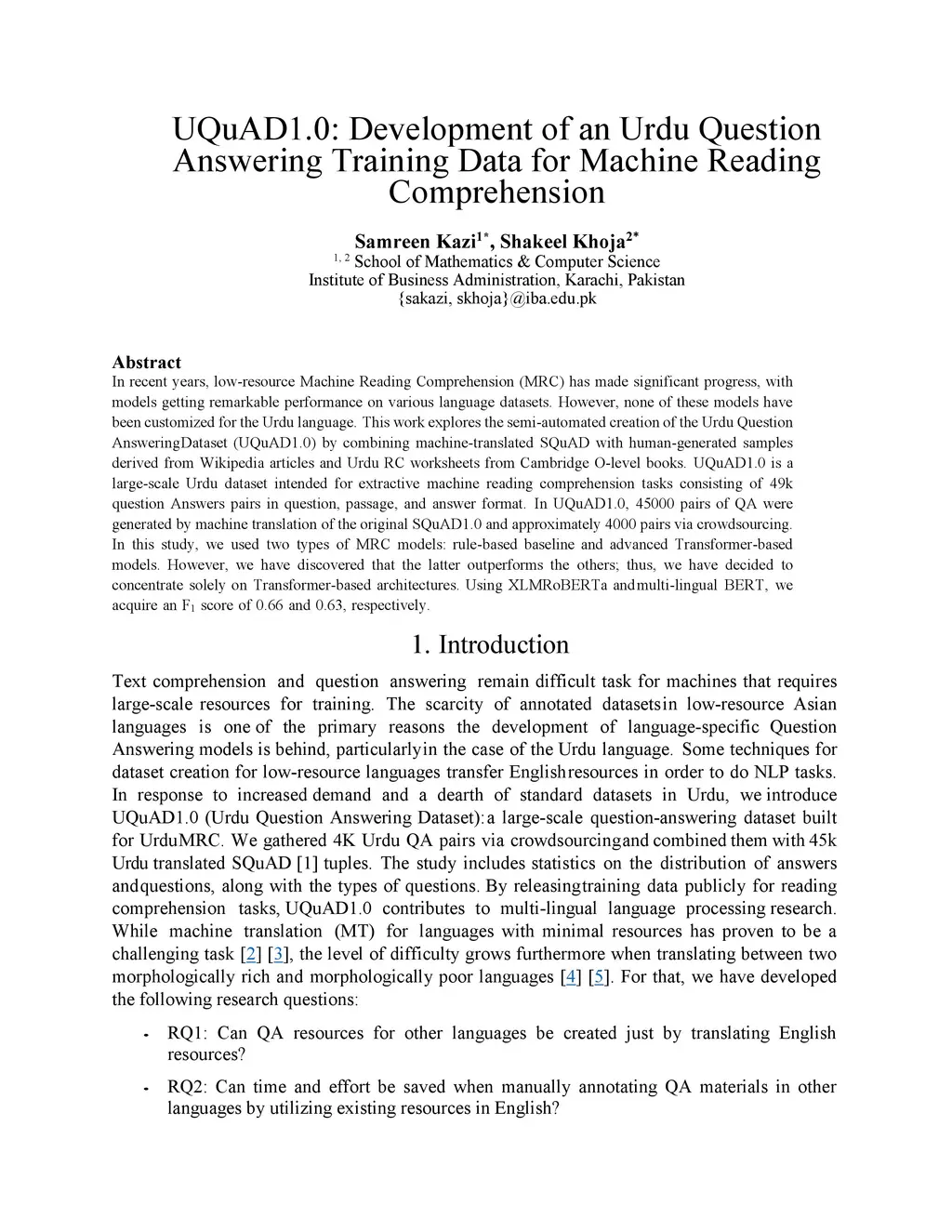 In recent years, low-resource Machine Reading Comprehension (MRC) has made significant progress, with models getting remarkable performance on various language datasets. However, none of these models have been customized for the Urdu language. This work explores the semi-automated creation of the Urdu Question Answering Dataset (UQuAD1.0) by combining machine-translated SQuAD with human-generated samples derived from Wikipedia articles and Urdu RC worksheets from Cambridge O-level books. UQuAD1.0 is a large-scale Urdu dataset intended for extractive machine reading comprehension tasks consisting of 49k question Answers pairs in question, passage, and answer format. In UQuAD1.0, 45000 pairs of QA were generated by machine translation of the original SQuAD1.0 and approximately 4000 pairs via crowdsourcing. In this study, we used two types of MRC models: rule-based baseline and advanced Transformer-based models. However, we have discovered that the latter outperforms the others; thus, we have decided to concentrate solely on Transformer-based architectures. Using XLMRoBERTa and multi-lingual BERT, we acquire an F1 score of 0.66 and 0.63, respectively.
