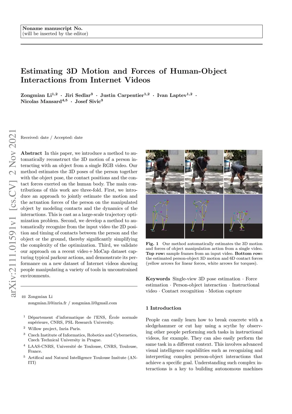 In this paper, we introduce a method to automatically reconstruct the 3D motion of a person interacting with an object from a single RGB video. Our method estimates the 3D poses of the person together with the object pose, the contact positions and the contact forces exerted on the human body. The main contributions of this work are three-fold. First, we introduce an approach to jointly estimate the motion and the actuation forces of the person on the manipulated object by modeling contacts and the dynamics of the interactions. This is cast as a large-scale trajectory optimization problem. Second, we develop a method to automatically recognize from the input video the 2D position and timing of contacts between the person and the object or the ground, thereby significantly simplifying the complexity of the optimization. Third, we validate our approach on a recent video+MoCap dataset capturing typical parkour actions, and demonstrate its performance on a new dataset of Internet videos showing people manipulating a variety of tools in unconstrained environments.