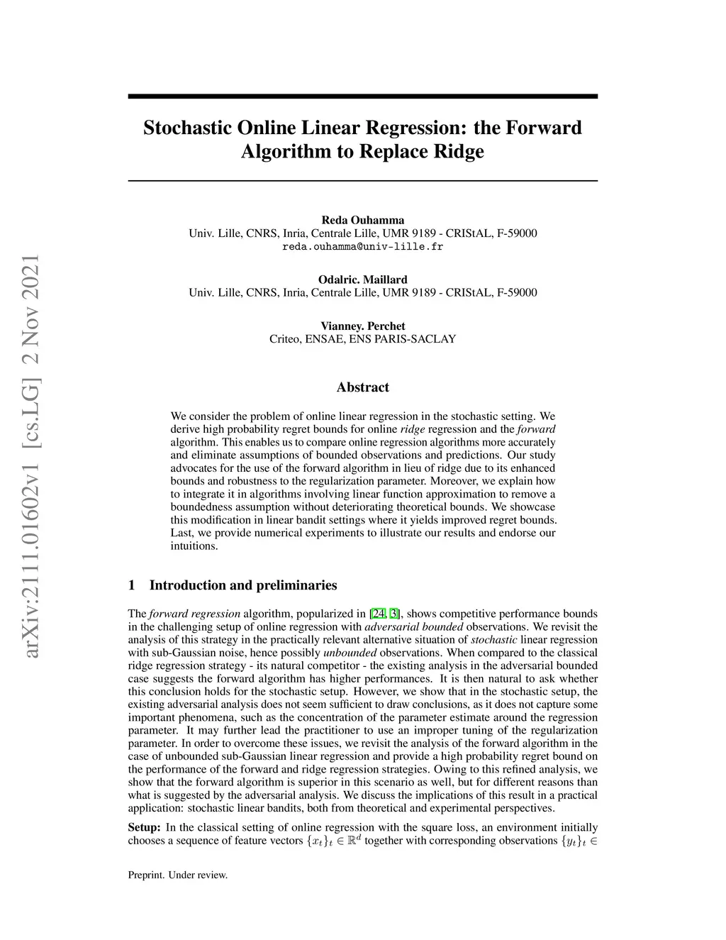 We consider the problem of online linear regression in the stochastic setting. We derive high probability regret bounds for online ridge regression and the forward algorithm. This enables us to compare online regression algorithms more accurately and eliminate assumptions of bounded observations and predictions. Our study advocates for the use of the forward algorithm in lieu of ridge due to its enhanced bounds and robustness to the regularization parameter. Moreover, we explain how to integrate it in algorithms involving linear function approximation to remove a boundedness assumption without deteriorating theoretical bounds. We showcase this modification in linear bandit settings where it yields improved regret bounds. Last, we provide numerical experiments to illustrate our results and endorse our intuitions.