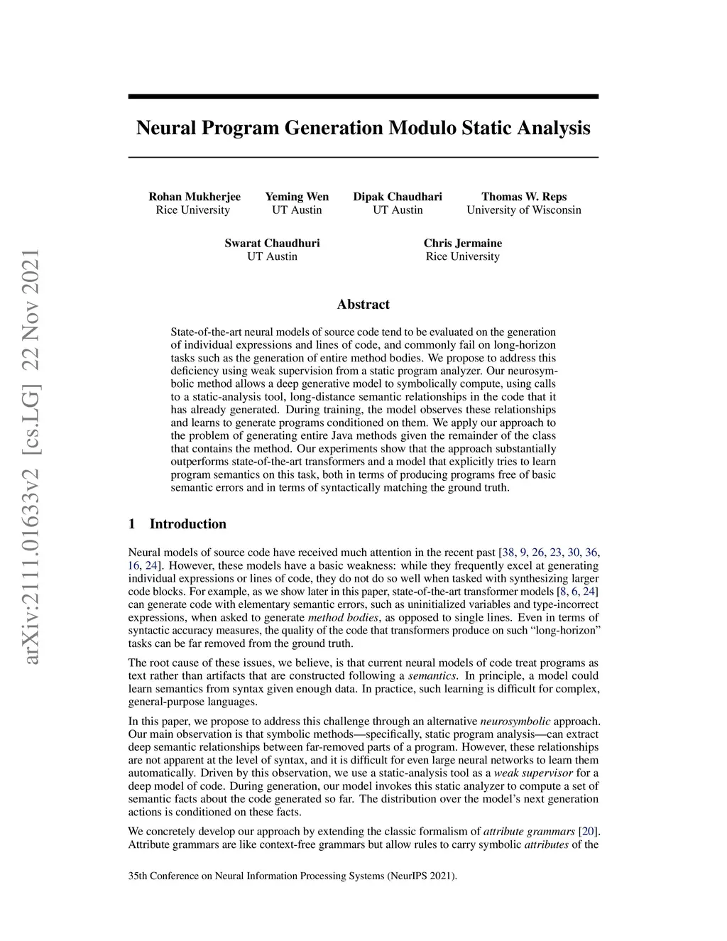State-of-the-art neural models of source code tend to be evaluated on the generation of individual expressions and lines of code, and commonly fail on long-horizon tasks such as the generation of entire method bodies. We propose to address this deficiency using weak supervision from a static program analyzer. Our neurosymbolic method allows a deep generative model to symbolically compute, using calls to a static-analysis tool, long-distance semantic relationships in the code that it has already generated. During training, the model observes these relationships and learns to generate programs conditioned on them. We apply our approach to the problem of generating entire Java methods given the remainder of the class that contains the method. Our experiments show that the approach substantially outperforms state-of-the-art transformers and a model that explicitly tries to learn program semantics on this task, both in terms of producing programs free of basic semantic errors and in terms of syntactically matching the ground truth.