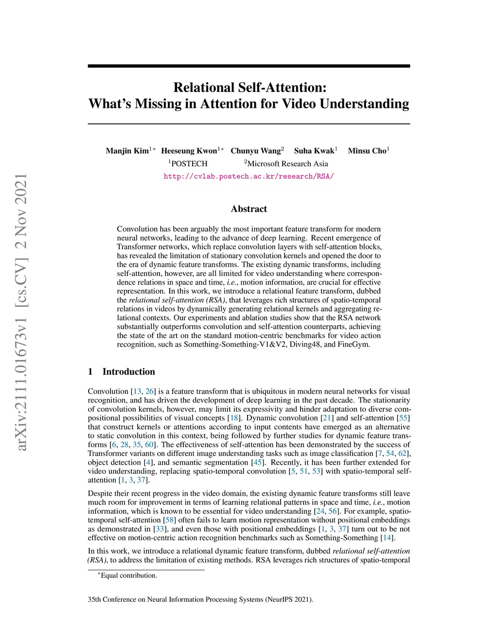Convolution has been arguably the most important feature transform for modern neural networks, leading to the advance of deep learning. Recent emergence of Transformer networks, which replace convolution layers with self-attention blocks, has revealed the limitation of stationary convolution kernels and opened the door to the era of dynamic feature transforms. The existing dynamic transforms, including self-attention, however, are all limited for video understanding where correspondence relations in space and time, i.e., motion information, are crucial for effective representation. In this work, we introduce a relational feature transform, dubbed the relational self-attention (RSA), that leverages rich structures of spatio-temporal relations in videos by dynamically generating relational kernels and aggregating relational contexts. Our experiments and ablation studies show that the RSA network substantially outperforms convolution and self-attention counterparts, achieving the state of the art on the standard motion-centric benchmarks for video action recognition, such as Something-Something-V1 & V2, Diving48, and FineGym.