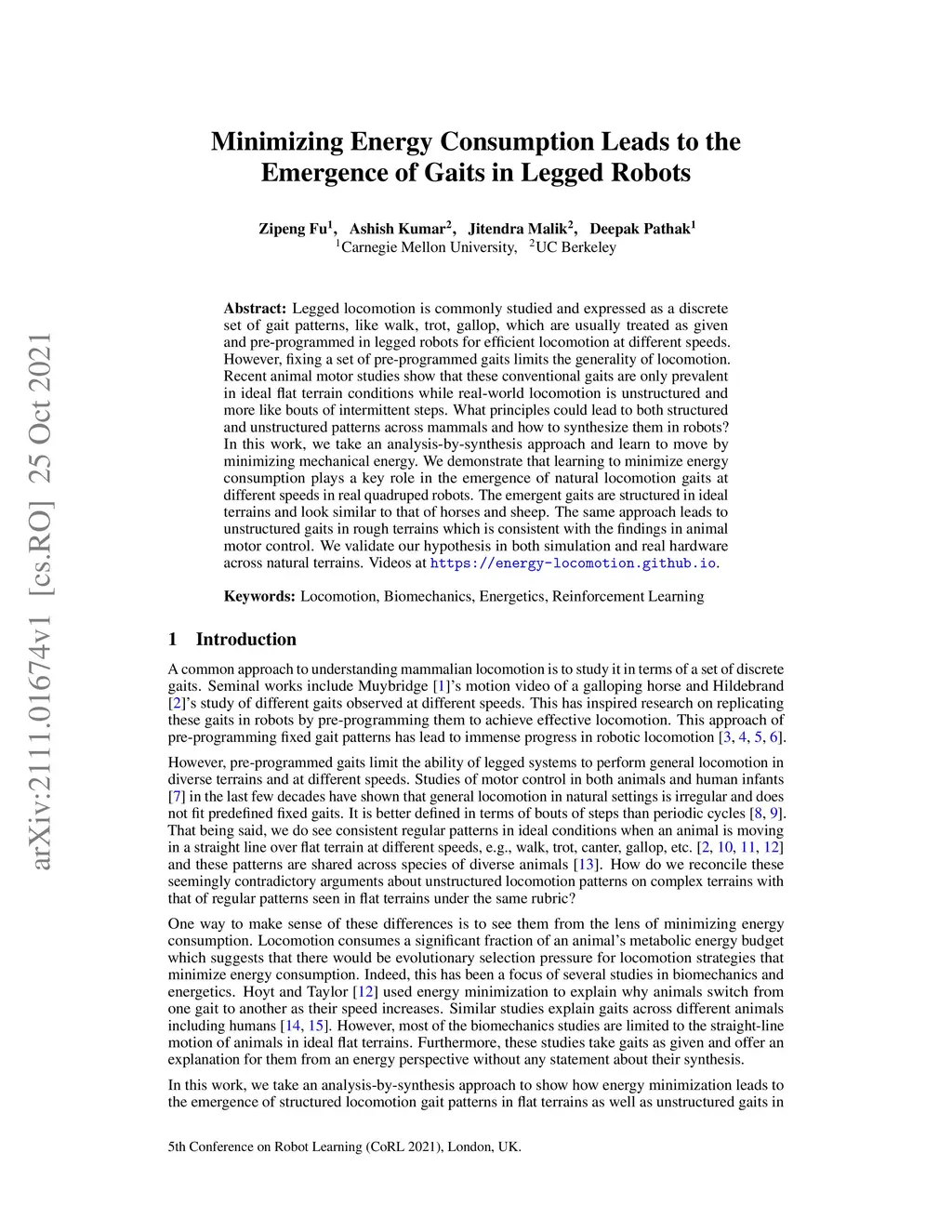 Legged locomotion is commonly studied and expressed as a discrete set of gait patterns, like walk, trot, gallop, which are usually treated as given and pre-programmed in legged robots for efficient locomotion at different speeds. However, fixing a set of pre-programmed gaits limits the generality of locomotion. Recent animal motor studies show that these conventional gaits are only prevalent in ideal flat terrain conditions while real-world locomotion is unstructured and more like bouts of intermittent steps. What principles could lead to both structured and unstructured patterns across mammals and how to synthesize them in robots? In this work, we take an analysis-by-synthesis approach and learn to move by minimizing mechanical energy. We demonstrate that learning to minimize energy consumption plays a key role in the emergence of natural locomotion gaits at different speeds in real quadruped robots. The emergent gaits are structured in ideal terrains and look similar to that of horses and sheep. The same approach leads to unstructured gaits in rough terrains which is consistent with the findings in animal motor control. We validate our hypothesis in both simulation and real hardware across natural terrains. Videos at https://energy-locomotion.github.io