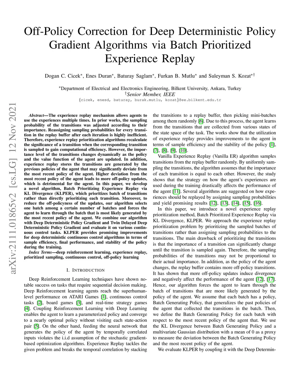 The experience replay mechanism allows agents to use the experiences multiple times. In prior works, the sampling probability of the transitions was adjusted according to their importance. Reassigning sampling probabilities for every transition in the replay buffer after each iteration is highly inefficient. Therefore, experience replay prioritization algorithms recalculate the significance of a transition when the corresponding transition is sampled to gain computational efficiency. However, the importance level of the transitions changes dynamically as the policy and the value function of the agent are updated. In addition, experience replay stores the transitions are generated by the previous policies of the agent that may significantly deviate from the most recent policy of the agent. Higher deviation from the most recent policy of the agent leads to more off-policy updates, which is detrimental for the agent. In this paper, we develop a novel algorithm, Batch Prioritizing Experience Replay via KL Divergence (KLPER), which prioritizes batch of transitions rather than directly prioritizing each transition. Moreover, to reduce the off-policyness of the updates, our algorithm selects one batch among a certain number of batches and forces the agent to learn through the batch that is most likely generated by the most recent policy of the agent. We combine our algorithm with Deep Deterministic Policy Gradient and Twin Delayed Deep Deterministic Policy Gradient and evaluate it on various continuous control tasks. KLPER provides promising improvements for deep deterministic continuous control algorithms in terms of sample efficiency, final performance, and stability of the policy during the training.