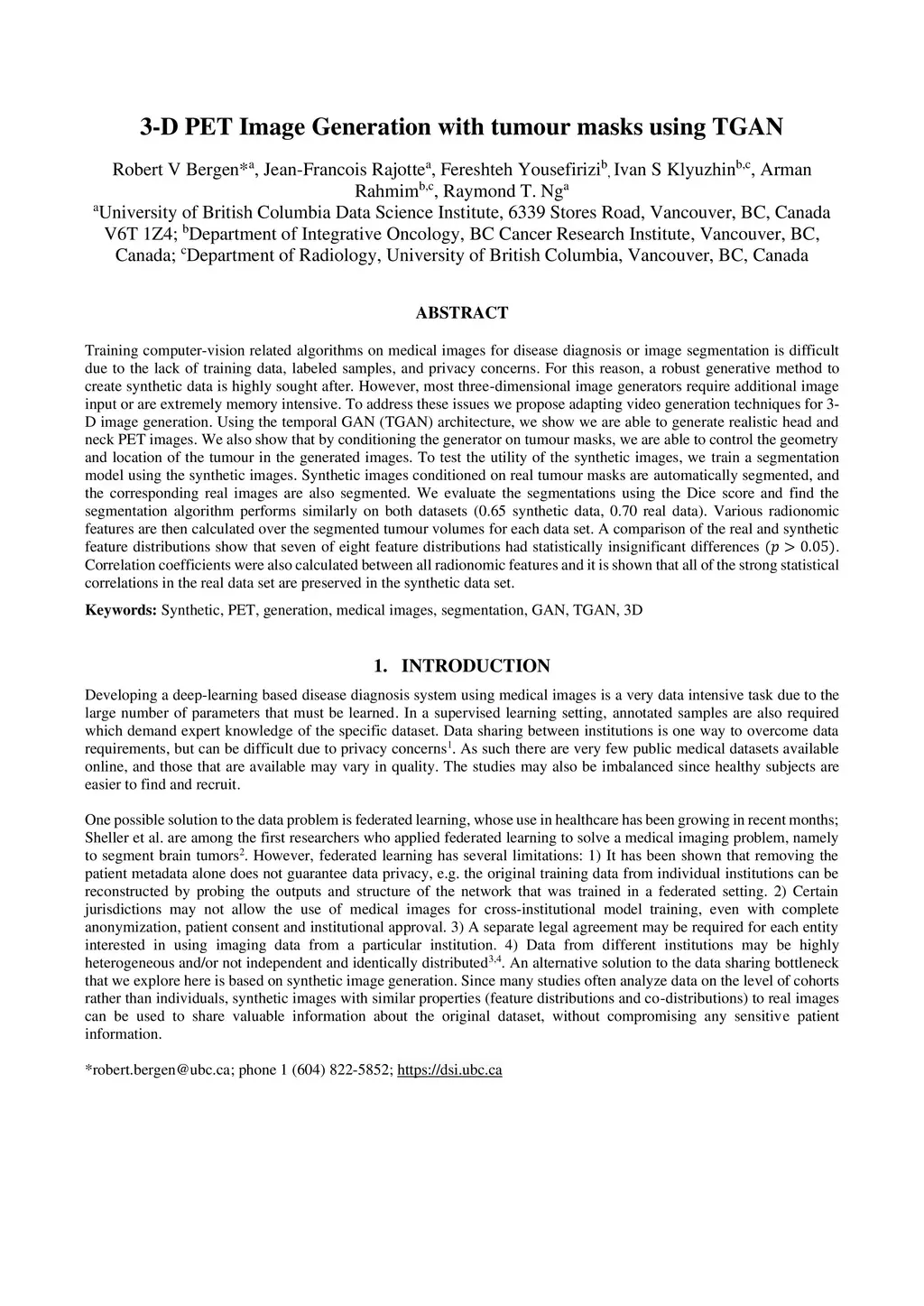 Training computer-vision related algorithms on medical images for disease diagnosis or image segmentation is difficult due to the lack of training data, labeled samples, and privacy concerns. For this reason, a robust generative method to create synthetic data is highly sought after. However, most three-dimensional image generators require additional image input or are extremely memory intensive. To address these issues we propose adapting video generation techniques for 3-D image generation. Using the temporal GAN (TGAN) architecture, we show we are able to generate realistic head and neck PET images. We also show that by conditioning the generator on tumour masks, we are able to control the geometry and location of the tumour in the generated images. To test the utility of the synthetic images, we train a segmentation model using the synthetic images. Synthetic images conditioned on real tumour masks are automatically segmented, and the corresponding real images are also segmented. We evaluate the segmentations using the Dice score and find the segmentation algorithm performs similarly on both datasets (0.65 synthetic data, 0.70 real data). Various radionomic features are then calculated over the segmented tumour volumes for each data set. A comparison of the real and synthetic feature distributions show that seven of eight feature distributions had statistically insignificant differences (p>0.05). Correlation coefficients were also calculated between all radionomic features and it is shown that all of the strong statistical correlations in the real data set are preserved in the synthetic data set.