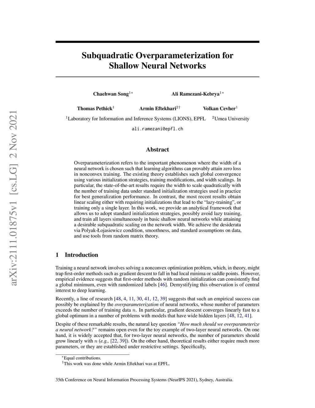 Overparameterization refers to the important phenomenon where the width of a neural network is chosen such that learning algorithms can provably attain zero loss in nonconvex training. The existing theory establishes such global convergence using various initialization strategies, training modifications, and width scalings. In particular, the state-of-the-art results require the width to scale quadratically with the number of training data under standard initialization strategies used in practice for best generalization performance. In contrast, the most recent results obtain linear scaling either with requiring initializations that lead to the "lazy-training", or training only a single layer. In this work, we provide an analytical framework that allows us to adopt standard initialization strategies, possibly avoid lazy training, and train all layers simultaneously in basic shallow neural networks while attaining a desirable subquadratic scaling on the network width. We achieve the desiderata via Polyak-Lojasiewicz condition, smoothness, and standard assumptions on data, and use tools from random matrix theory.