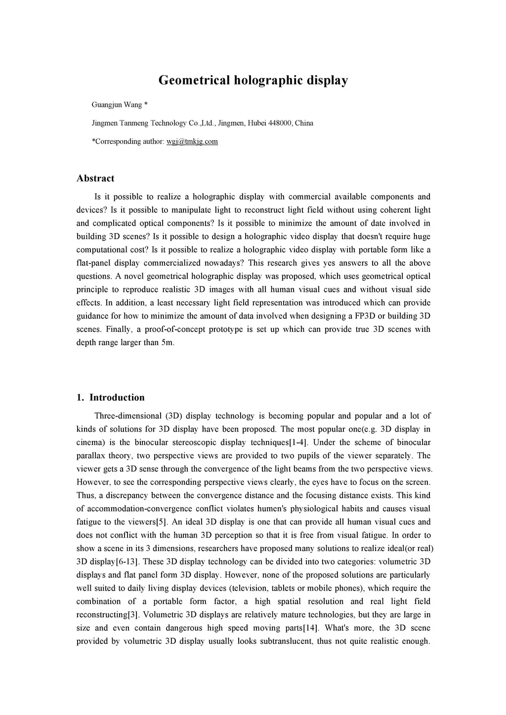 Is it possible to realize a holographic display with commercial available components and devices? Is it possible to manipulate light to reconstruct light field without using coherent light and complicated optical components? Is it possible to minimize the amount of date involved in building 3D scenes? Is it possible to design a holographic video display that doesn't require huge computational cost? Is it possible to realize a holographic video display with portable form like a flat-panel display commercialized nowadays? This research gives yes answers to all the above questions. A novel geometrical holographic display was proposed, which uses geometrical optical principle to reproduce realistic 3D images with all human visual cues and without visual side effects. In addition, a least necessary light field representation was introduced which can provide guidance for how to minimize the amount of data involved when designing a FP3D or building 3D scenes. Finally, a proof-of-concept prototype is set up which can provide true 3D scenes with depth range larger than 5m.