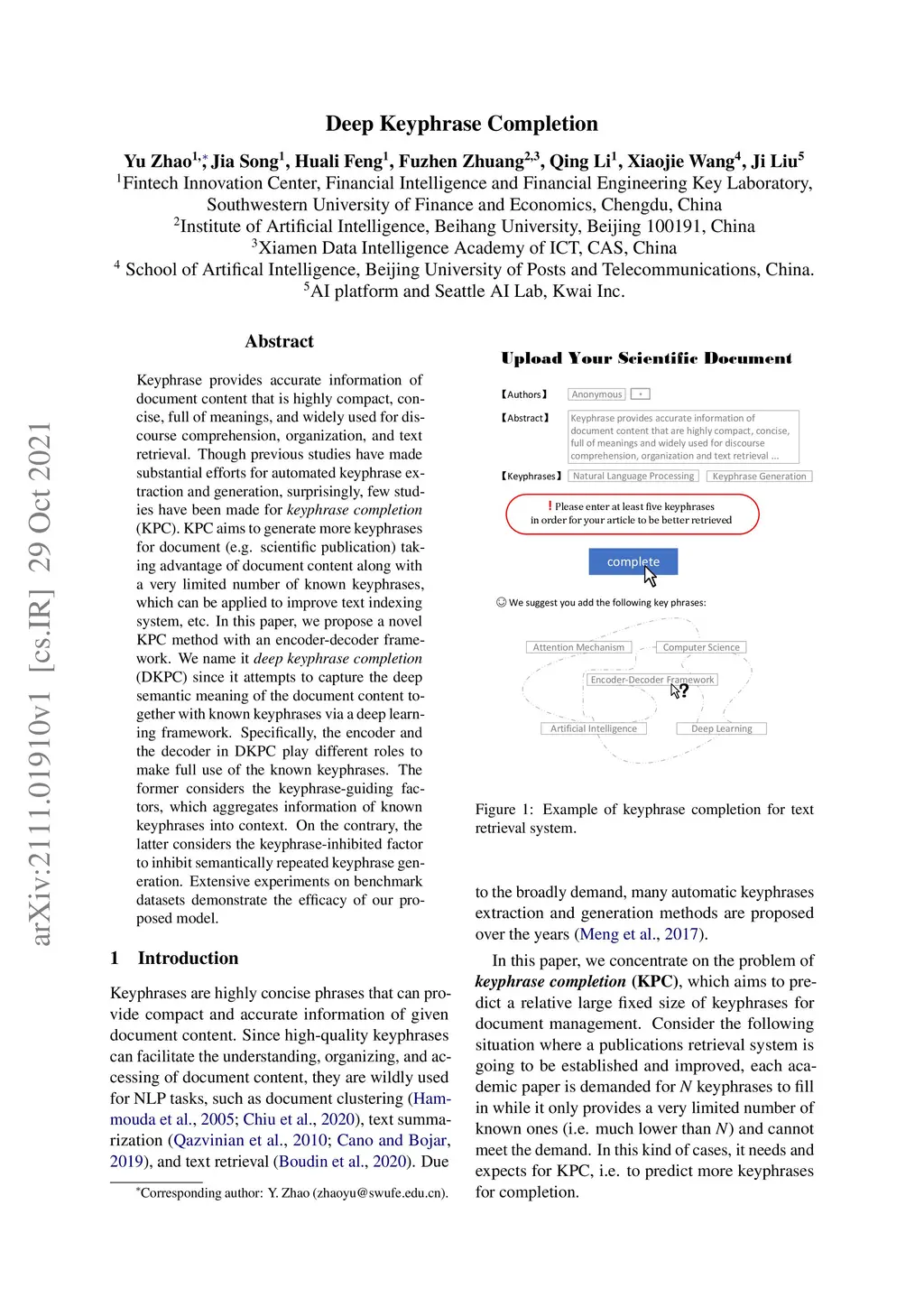 Keyphrase provides accurate information of document content that is highly compact, concise, full of meanings, and widely used for discourse comprehension, organization, and text retrieval. Though previous studies have made substantial efforts for automated keyphrase extraction and generation, surprisingly, few studies have been made for \textit{keyphrase completion} (KPC). KPC aims to generate more keyphrases for document (e.g. scientific publication) taking advantage of document content along with a very limited number of known keyphrases, which can be applied to improve text indexing system, etc. In this paper, we propose a novel KPC method with an encoder-decoder framework. We name it \textit{deep keyphrase completion} (DKPC) since it attempts to capture the deep semantic meaning of the document content together with known keyphrases via a deep learning framework. Specifically, the encoder and the decoder in DKPC play different roles to make full use of the known keyphrases. The former considers the keyphrase-guiding factors, which aggregates information of known keyphrases into context. On the contrary, the latter considers the keyphrase-inhibited factor to inhibit semantically repeated keyphrase generation. Extensive experiments on benchmark datasets demonstrate the efficacy of our proposed model.