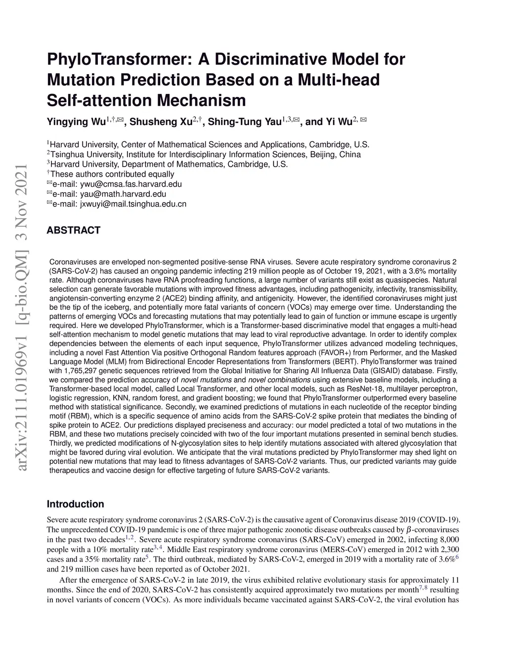 Severe acute respiratory syndrome coronavirus 2 (SARS-CoV-2) has caused an ongoing pandemic infecting 219 million people as of 10/19/21, with a 3.6% mortality rate. Natural selection can generate favorable mutations with improved fitness advantages; however, the identified coronaviruses may be the tip of the iceberg, and potentially more fatal variants of concern (VOCs) may emerge over time. Understanding the patterns of emerging VOCs and forecasting mutations that may lead to gain of function or immune escape is urgently required. Here we developed PhyloTransformer, a Transformer-based discriminative model that engages a multi-head self-attention mechanism to model genetic mutations that may lead to viral reproductive advantage. In order to identify complex dependencies between the elements of each input sequence, PhyloTransformer utilizes advanced modeling techniques, including a novel Fast Attention Via positive Orthogonal Random features approach (FAVOR+) from Performer, and the Masked Language Model (MLM) from Bidirectional Encoder Representations from Transformers (BERT). PhyloTransformer was trained with 1,765,297 genetic sequences retrieved from the Global Initiative for Sharing All Influenza Data (GISAID) database. Firstly, we compared the prediction accuracy of novel mutations and novel combinations using extensive baseline models; we found that PhyloTransformer outperformed every baseline method with statistical significance. Secondly, we examined predictions of mutations in each nucleotide of the receptor binding motif (RBM), and we found our predictions were precise and accurate. Thirdly, we predicted modifications of N-glycosylation sites to identify mutations associated with altered glycosylation that may be favored during viral evolution. We anticipate that PhyloTransformer may guide proactive vaccine design for effective targeting of future SARS-CoV-2 variants.