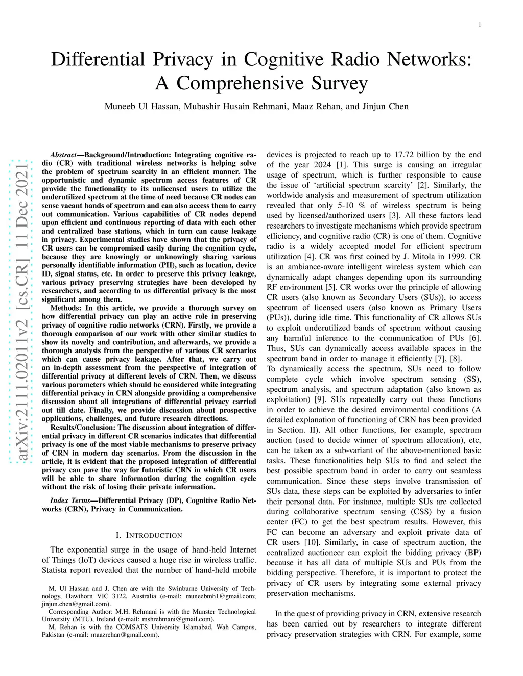 Background/Introduction: Integrating cognitive radio (CR) with traditional wireless networks is helping solve the problem of spectrum scarcity in an efficient manner. The opportunistic and dynamic spectrum access features of CR provide the functionality to its unlicensed users to utilize the underutilized spectrum at the time of need because CR nodes can sense vacant bands of spectrum and can also access them to carry out communication. Various capabilities of CR nodes depend upon efficient and continuous reporting of data with each other and centralized base stations, which in turn can cause leakage in privacy. Experimental studies have shown that the privacy of CR users can be compromised easily during the cognition cycle, because they are knowingly or unknowingly sharing various personally identifiable information (PII), such as location, device ID, signal status, etc. In order to preserve this privacy leakage, various privacy preserving strategies have been developed by researchers, and according to us differential privacy is the most significant among them.