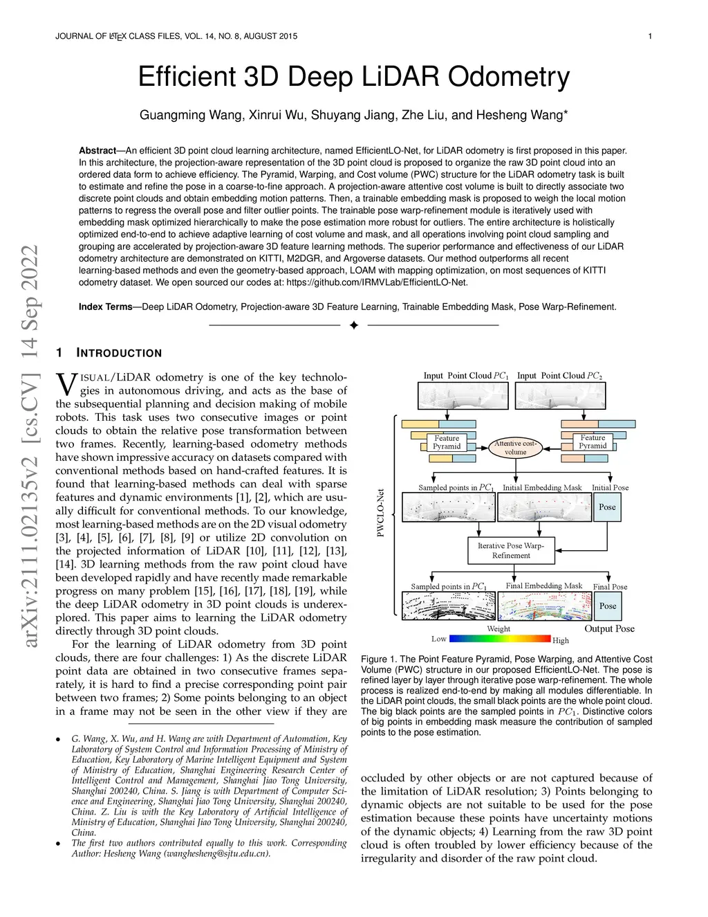 An efficient 3D point cloud learning architecture, named EfficientLO-Net, for LiDAR odometry is first proposed in this paper. In this architecture, the projection-aware representation of the 3D point cloud is proposed to organize the raw 3D point cloud into an ordered data form to achieve efficiency. The Pyramid, Warping, and Cost volume (PWC) structure for the LiDAR odometry task is built to estimate and refine the pose in a coarse-to-fine approach. A projection-aware attentive cost volume is built to directly associate two discrete point clouds and obtain embedding motion patterns. Then, a trainable embedding mask is proposed to weigh the local motion patterns to regress the overall pose and filter outlier points. The trainable pose warp-refinement module is iteratively used with embedding mask optimized hierarchically to make the pose estimation more robust for outliers. The entire architecture is holistically optimized end-to-end to achieve adaptive learning of cost volume and mask, and all operations involving point cloud sampling and grouping are accelerated by projection-aware 3D feature learning methods. The superior performance and effectiveness of our LiDAR odometry architecture are demonstrated on KITTI, M2DGR, and Argoverse datasets. Our method outperforms all recent learning-based methods and even the geometry-based approach, LOAM with mapping optimization, on most sequences of KITTI odometry dataset. We open sourced our codes at: https://github.com/IRMVLab/EfficientLO-Net.