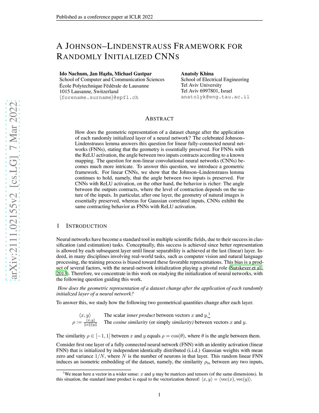 How does the geometric representation of a dataset change after the application of each randomly initialized layer of a neural network? The celebrated Johnson--Lindenstrauss lemma answers this question for linear fully-connected neural networks (FNNs), stating that the geometry is essentially preserved. For FNNs with the ReLU activation, the angle between two inputs contracts according to a known mapping. The question for non-linear convolutional neural networks (CNNs) becomes much more intricate. To answer this question, we introduce a geometric framework. For linear CNNs, we show that the Johnson--Lindenstrauss lemma continues to hold, namely, that the angle between two inputs is preserved. For CNNs with ReLU activation, on the other hand, the behavior is richer: The angle between the outputs contracts, where the level of contraction depends on the nature of the inputs. In particular, after one layer, the geometry of natural images is essentially preserved, whereas for Gaussian correlated inputs, CNNs exhibit the same contracting behavior as FNNs with ReLU activation.
