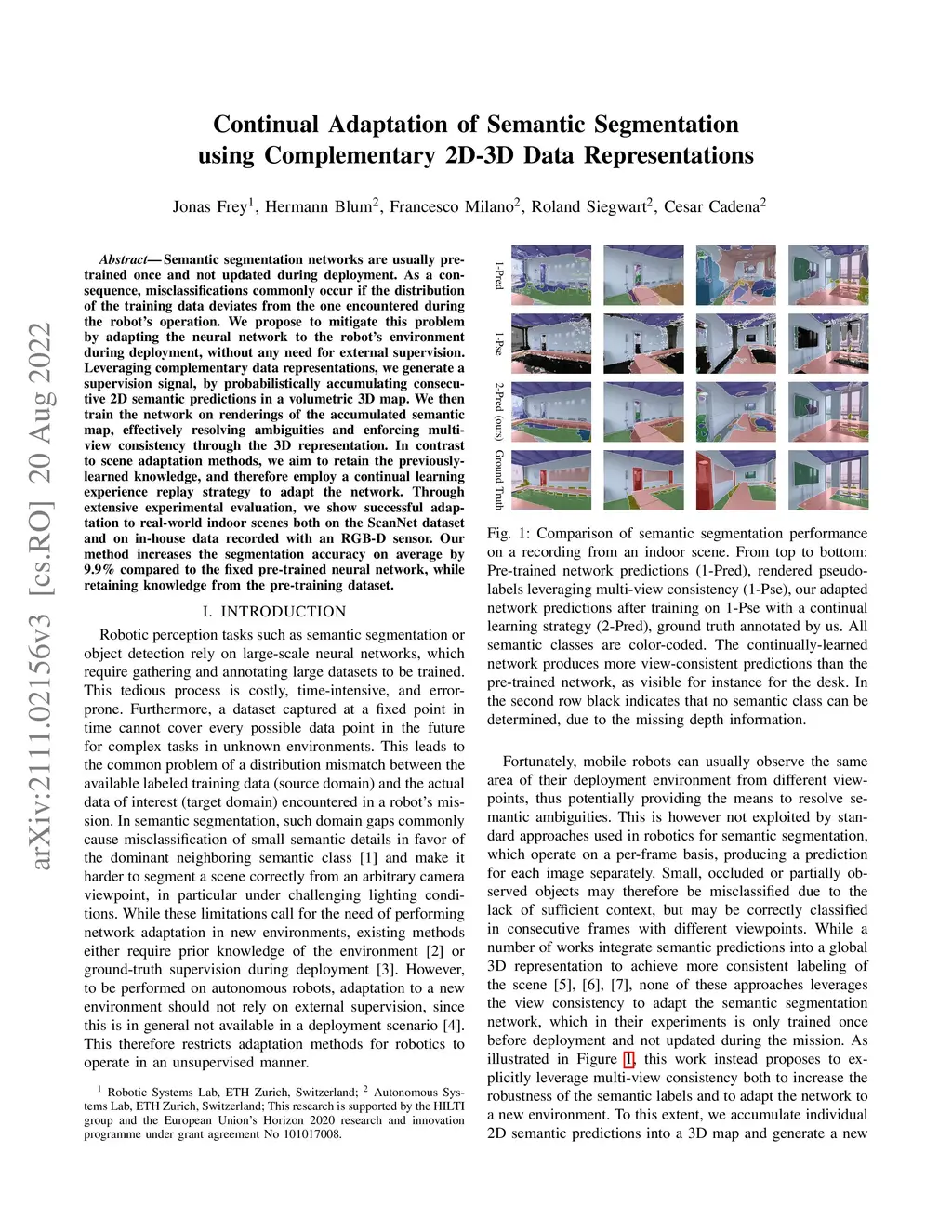 Semantic segmentation networks are usually pre-trained once and not updated during deployment. As a consequence, misclassifications commonly occur if the distribution of the training data deviates from the one encountered during the robot's operation. We propose to mitigate this problem by adapting the neural network to the robot's environment during deployment, without any need for external supervision. Leveraging complementary data representations, we generate a supervision signal, by probabilistically accumulating consecutive 2D semantic predictions in a volumetric 3D map. We then train the network on renderings of the accumulated semantic map, effectively resolving ambiguities and enforcing multi-view consistency through the 3D representation. In contrast to scene adaptation methods, we aim to retain the previously-learned knowledge, and therefore employ a continual learning experience replay strategy to adapt the network. Through extensive experimental evaluation, we show successful adaptation to real-world indoor scenes both on the ScanNet dataset and on in-house data recorded with an RGB-D sensor. Our method increases the segmentation accuracy on average by 9.9% compared to the fixed pre-trained neural network, while retaining knowledge from the pre-training dataset.