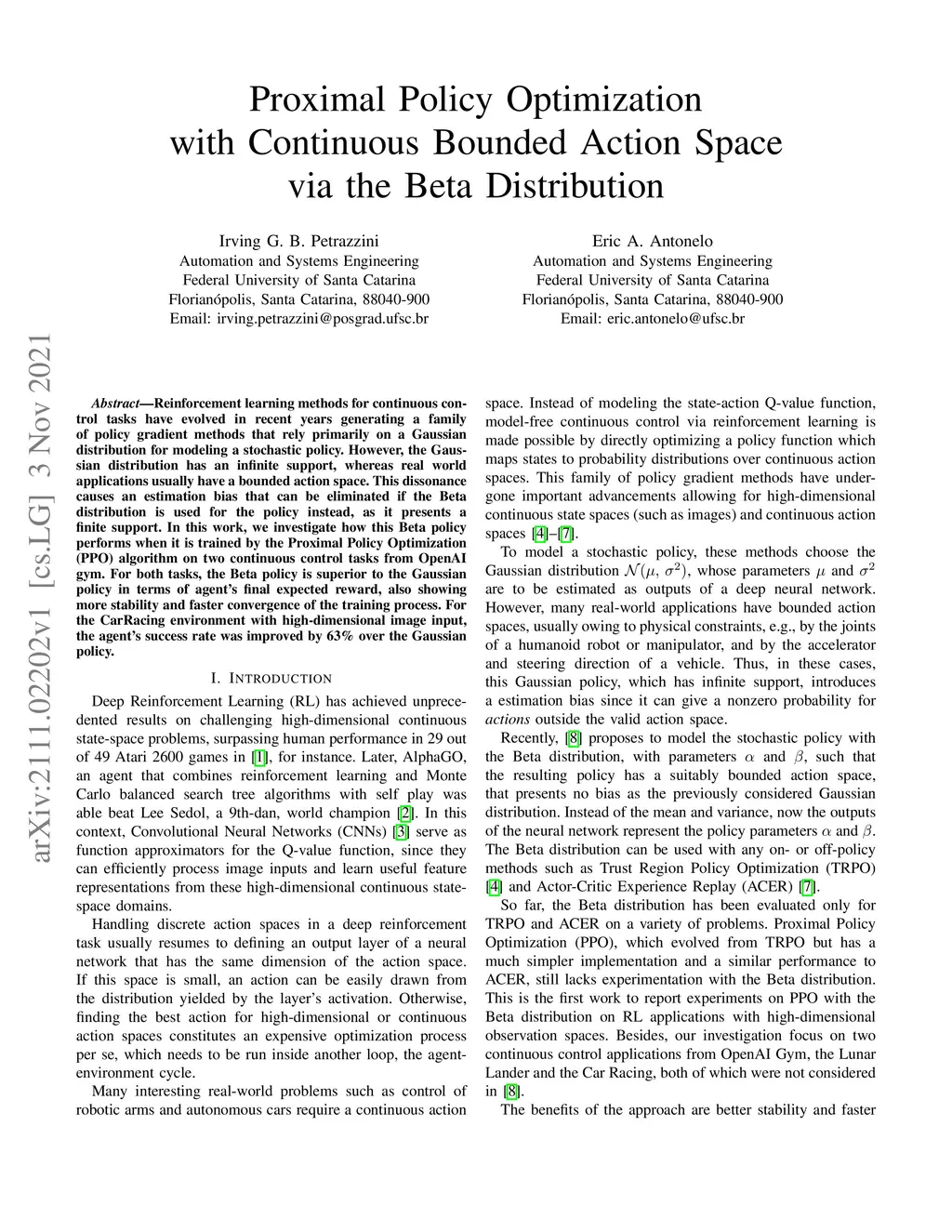 Reinforcement learning methods for continuous control tasks have evolved in recent years generating a family of policy gradient methods that rely primarily on a Gaussian distribution for modeling a stochastic policy. However, the Gaussian distribution has an infinite support, whereas real world applications usually have a bounded action space. This dissonance causes an estimation bias that can be eliminated if the Beta distribution is used for the policy instead, as it presents a finite support. In this work, we investigate how this Beta policy performs when it is trained by the Proximal Policy Optimization (PPO) algorithm on two continuous control tasks from OpenAI gym. For both tasks, the Beta policy is superior to the Gaussian policy in terms of agent's final expected reward, also showing more stability and faster convergence of the training process. For the CarRacing environment with high-dimensional image input, the agent's success rate was improved by 63% over the Gaussian policy.