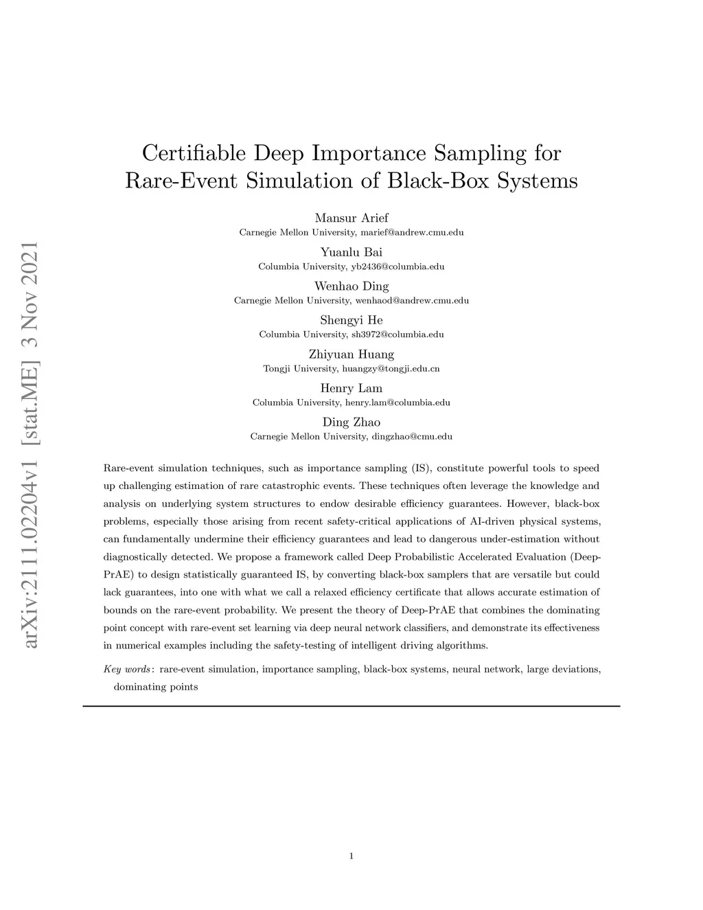 Rare-event simulation techniques, such as importance sampling (IS), constitute powerful tools to speed up challenging estimation of rare catastrophic events. These techniques often leverage the knowledge and analysis on underlying system structures to endow desirable efficiency guarantees. However, black-box problems, especially those arising from recent safety-critical applications of AI-driven physical systems, can fundamentally undermine their efficiency guarantees and lead to dangerous under-estimation without diagnostically detected. We propose a framework called Deep Probabilistic Accelerated Evaluation (Deep-PrAE) to design statistically guaranteed IS, by converting black-box samplers that are versatile but could lack guarantees, into one with what we call a relaxed efficiency certificate that allows accurate estimation of bounds on the rare-event probability. We present the theory of Deep-PrAE that combines the dominating point concept with rare-event set learning via deep neural network classifiers, and demonstrate its effectiveness in numerical examples including the safety-testing of intelligent driving algorithms.