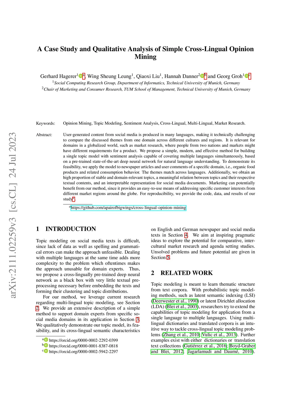 User-generated content from social media is produced in many languages, making it technically challenging to compare the discussed themes from one domain across different cultures and regions. It is relevant for domains in a globalized world, such as market research, where people from two nations and markets might have different requirements for a product. We propose a simple, modern, and effective method for building a single topic model with sentiment analysis capable of covering multiple languages simultanteously, based on a pre-trained state-of-the-art deep neural network for natural language understanding. To demonstrate its feasibility, we apply the model to newspaper articles and user comments of a specific domain, i.e., organic food products and related consumption behavior. The themes match across languages. Additionally, we obtain an high proportion of stable and domain-relevant topics, a meaningful relation between topics and their respective textual contents, and an interpretable representation for social media documents. Marketing can potentially benefit from our method, since it provides an easy-to-use means of addressing specific customer interests from different market regions around the globe. For reproducibility, we provide the code, data, and results of our study.