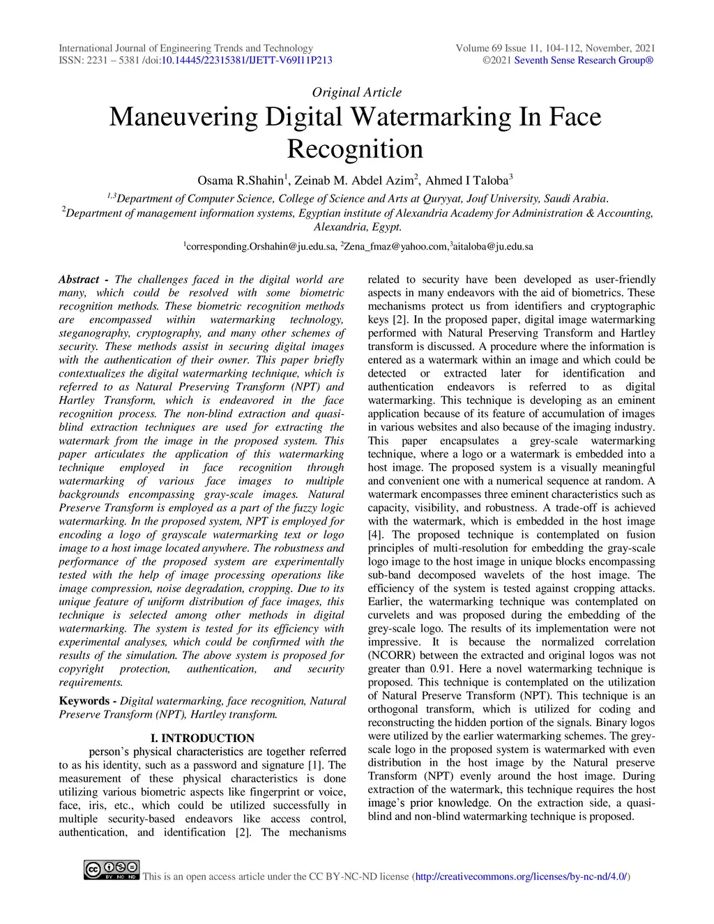 The challenges faced in the digital world are many, which could be resolved with some biometric recognition methods. These biometric recognition methods are encompassed within watermarking technology, steganography, cryptography, and many other schemes of security. These methods assist in securing digital images with the authentication of their owner. This paper briefly contextualizes the digital watermarking technique, which is referred to as Natural Preserving Transform (NPT) and Hartley Transform, which is endeavored in the face recognition process. The non-blind extraction and quasi-blind extraction techniques are used for extracting the watermark from the image in the proposed system. This paper articulates the application of this watermarking technique employed in face recognition through watermarking of various face images to multiple backgrounds encompassing gray-scale images. Natural Preserve Transform is employed as a part of the fuzzy logic watermarking. In the proposed system, NPT is employed for encoding a logo of grayscale watermarking text or logo image to a host image located anywhere. The robustness and performance of the proposed system are experimentally tested with the help of image processing operations like image compression, noise degradation, cropping. Due to its unique feature of uniform distribution of face images, this technique is selected among other methods in digital watermarking. The system is tested for its efficiency with experimental analyses, which could be confirmed with the results of the simulation. The above system is proposed for copyright protection, authentication, and security requirements.