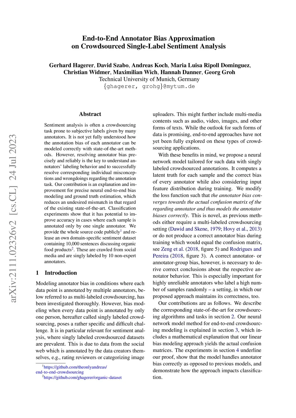 Sentiment analysis is often a crowdsourcing task prone to subjective labels given by many annotators. It is not yet fully understood how the annotation bias of each annotator can be modeled correctly with state-of-the-art methods. However, resolving annotator bias precisely and reliably is the key to understand annotators' labeling behavior and to successfully resolve corresponding individual misconceptions and wrongdoings regarding the annotation task. Our contribution is an explanation and improvement for precise neural end-to-end bias modeling and ground truth estimation, which reduces an undesired mismatch in that regard of the existing state-of-the-art. Classification experiments show that it has potential to improve accuracy in cases where each sample is annotated only by one single annotator. We provide the whole source code publicly and release an own domain-specific sentiment dataset containing 10,000 sentences discussing organic food products. These are crawled from social media and are singly labeled by 10 non-expert annotators.