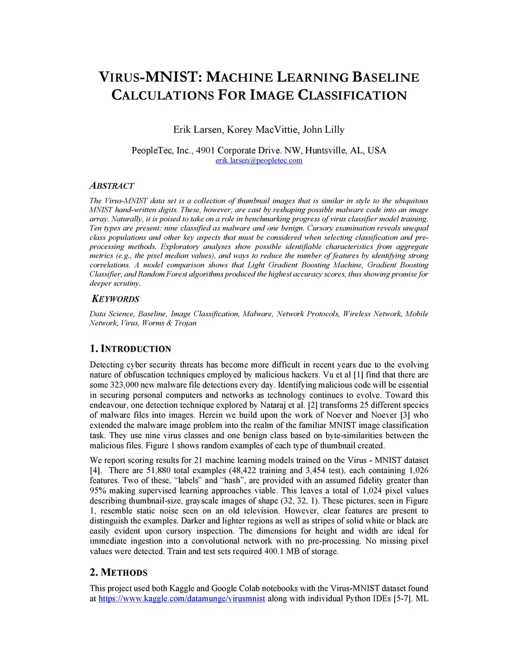 The Virus-MNIST data set is a collection of thumbnail images that is similar in style to the ubiquitous MNIST hand-written digits. These, however, are cast by reshaping possible malware code into an image array. Naturally, it is poised to take on a role in benchmarking progress of virus classifier model training. Ten types are present: nine classified as malware and one benign. Cursory examination reveals unequal class populations and other key aspects that must be considered when selecting classification and pre-processing methods. Exploratory analyses show possible identifiable characteristics from aggregate metrics (e.g., the pixel median values), and ways to reduce the number of features by identifying strong correlations. A model comparison shows that Light Gradient Boosting Machine, Gradient Boosting Classifier, and Random Forest algorithms produced the highest accuracy scores, thus showing promise for deeper scrutiny.