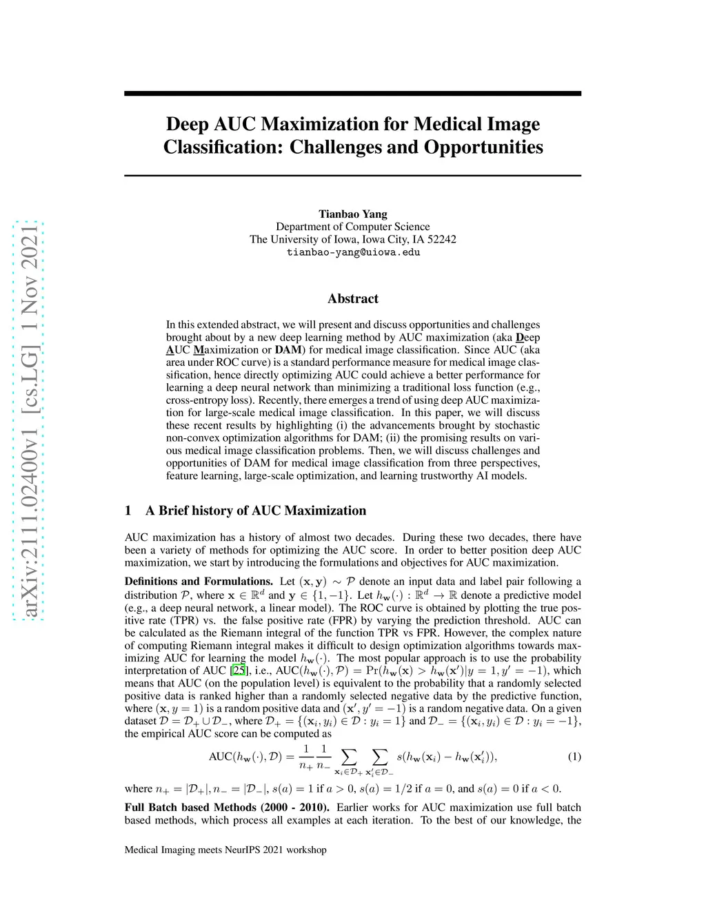 In this extended abstract, we will present and discuss opportunities and challenges brought about by a new deep learning method by AUC maximization (aka \underline{\bf D}eep \underline{\bf A}UC \underline{\bf M}aximization or {\bf DAM}) for medical image classification. Since AUC (aka area under ROC curve) is a standard performance measure for medical image classification, hence directly optimizing AUC could achieve a better performance for learning a deep neural network than minimizing a traditional loss function (e.g., cross-entropy loss). Recently, there emerges a trend of using deep AUC maximization for large-scale medical image classification. In this paper, we will discuss these recent results by highlighting (i) the advancements brought by stochastic non-convex optimization algorithms for DAM; (ii) the promising results on various medical image classification problems. Then, we will discuss challenges and opportunities of DAM for medical image classification from three perspectives, feature learning, large-scale optimization, and learning trustworthy AI models.
