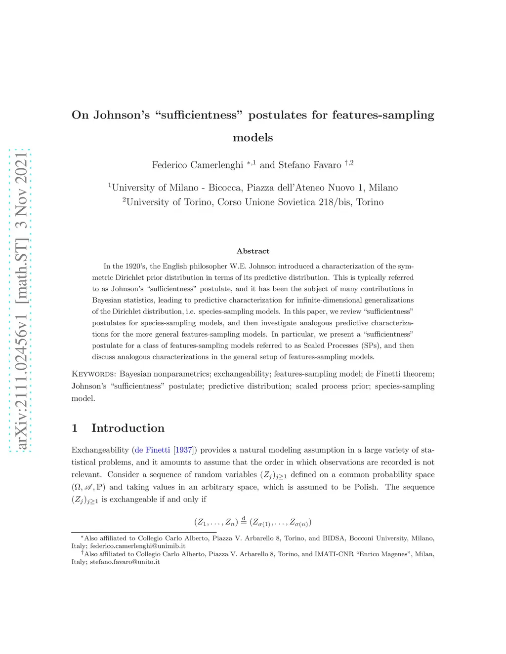 In the 1920's, the English philosopher W.E. Johnson introduced a characterization of the symmetric Dirichlet prior distribution in terms of its predictive distribution. This is typically referred to as Johnson's "sufficientness" postulate, and it has been the subject of many contributions in Bayesian statistics, leading to predictive characterization for infinite-dimensional generalizations of the Dirichlet distribution, i.e. species-sampling models. In this paper, we review "sufficientness" postulates for species-sampling models, and then investigate analogous predictive characterizations for the more general features-sampling models. In particular, we present a "sufficientness" postulate for a class of features-sampling models referred to as Scaled Processes (SPs), and then discuss analogous characterizations in the general setup of features-sampling models.