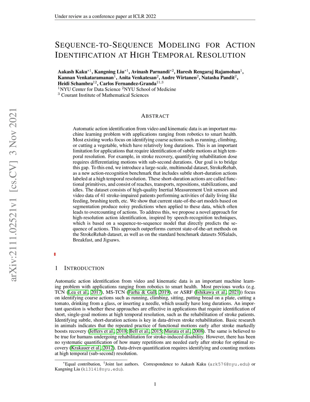 Automatic action identification from video and kinematic data is an important machine learning problem with applications ranging from robotics to smart health. Most existing works focus on identifying coarse actions such as running, climbing, or cutting a vegetable, which have relatively long durations. This is an important limitation for applications that require the identification of subtle motions at high temporal resolution. For example, in stroke recovery, quantifying rehabilitation dose requires differentiating motions with sub-second durations. Our goal is to bridge this gap. To this end, we introduce a large-scale, multimodal dataset, StrokeRehab, as a new action-recognition benchmark that includes subtle short-duration actions labeled at a high temporal resolution. These short-duration actions are called functional primitives, and consist of reaches, transports, repositions, stabilizations, and idles. The dataset consists of high-quality Inertial Measurement Unit sensors and video data of 41 stroke-impaired patients performing activities of daily living like feeding, brushing teeth, etc. We show that current state-of-the-art models based on segmentation produce noisy predictions when applied to these data, which often leads to overcounting of actions. To address this, we propose a novel approach for high-resolution action identification, inspired by speech-recognition techniques, which is based on a sequence-to-sequence model that directly predicts the sequence of actions. This approach outperforms current state-of-the-art methods on the StrokeRehab dataset, as well as on the standard benchmark datasets 50Salads, Breakfast, and Jigsaws.