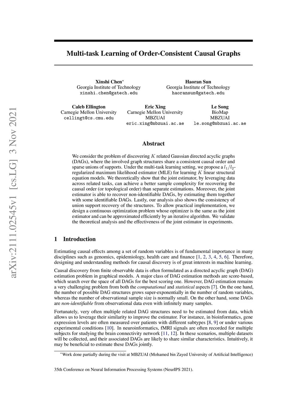 We consider the problem of discovering related Gaussian directed acyclic graphs (DAGs), where the involved graph structures share a consistent causal order and sparse unions of supports. Under the multi-task learning setting, we propose a -regularized maximum likelihood estimator (MLE) for learning linear structural equation models. We theoretically show that the joint estimator, by leveraging data across related tasks, can achieve a better sample complexity for recovering the causal order (or topological order) than separate estimations. Moreover, the joint estimator is able to recover non-identifiable DAGs, by estimating them together with some identifiable DAGs. Lastly, our analysis also shows the consistency of union support recovery of the structures. To allow practical implementation, we design a continuous optimization problem whose optimizer is the same as the joint estimator and can be approximated efficiently by an iterative algorithm. We validate the theoretical analysis and the effectiveness of the joint estimator in experiments.