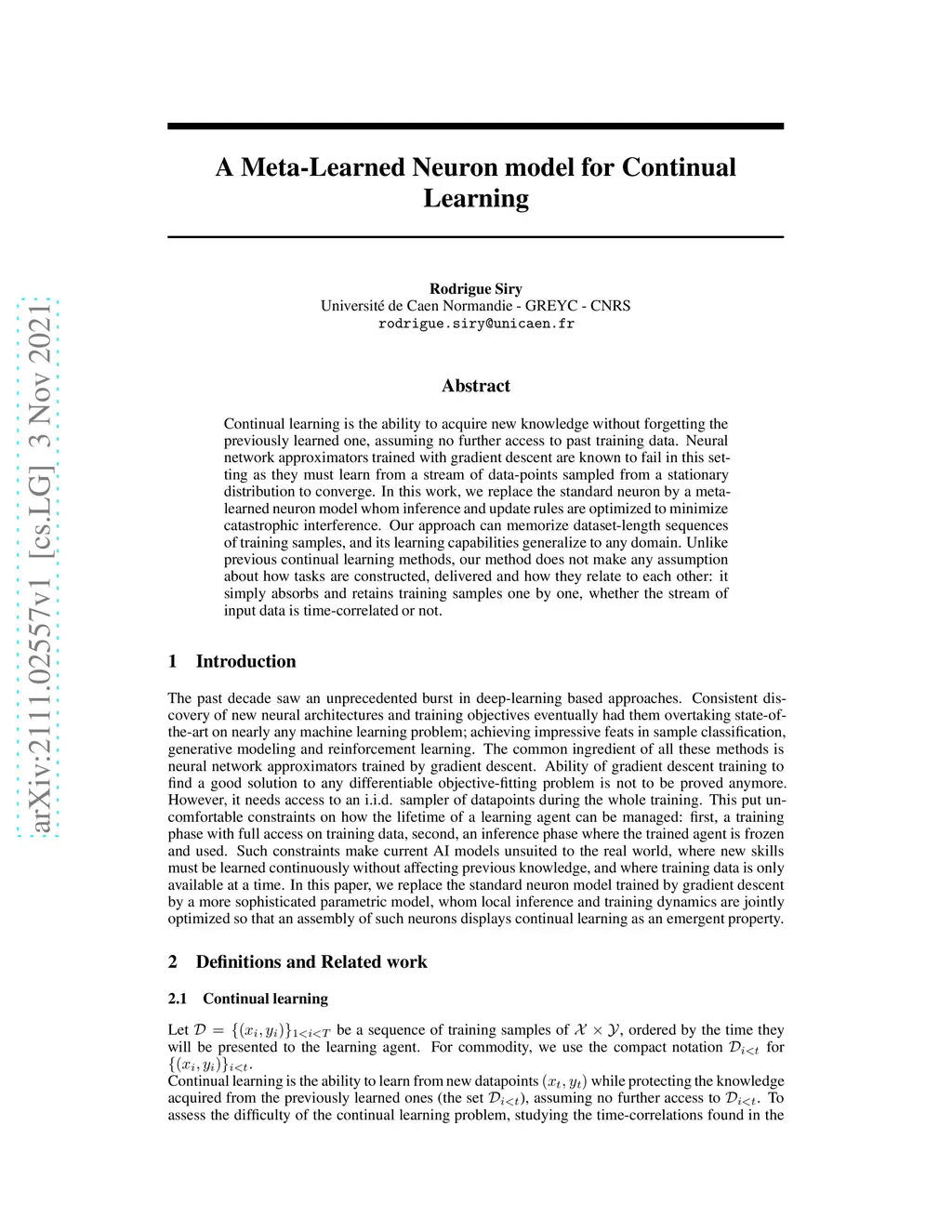 Continual learning is the ability to acquire new knowledge without forgetting the previously learned one, assuming no further access to past training data. Neural network approximators trained with gradient descent are known to fail in this setting as they must learn from a stream of data-points sampled from a stationary distribution to converge. In this work, we replace the standard neuron by a meta-learned neuron model whom inference and update rules are optimized to minimize catastrophic interference. Our approach can memorize dataset-length sequences of training samples, and its learning capabilities generalize to any domain. Unlike previous continual learning methods, our method does not make any assumption about how tasks are constructed, delivered and how they relate to each other: it simply absorbs and retains training samples one by one, whether the stream of input data is time-correlated or not.