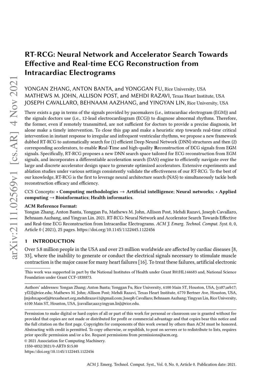 There exists a gap in terms of the signals provided by pacemakers (i.e., intracardiac electrogram (EGM)) and the signals doctors use (i.e., 12-lead electrocardiogram (ECG)) to diagnose abnormal rhythms. Therefore, the former, even if remotely transmitted, are not sufficient for doctors to provide a precise diagnosis, let alone make a timely intervention. To close this gap and make a heuristic step towards real-time critical intervention in instant response to irregular and infrequent ventricular rhythms, we propose a new framework dubbed RT-RCG to automatically search for (1) efficient Deep Neural Network (DNN) structures and then (2)corresponding accelerators, to enable Real-Time and high-quality Reconstruction of ECG signals from EGM signals. Specifically, RT-RCG proposes a new DNN search space tailored for ECG reconstruction from EGM signals, and incorporates a differentiable acceleration search (DAS) engine to efficiently navigate over the large and discrete accelerator design space to generate optimized accelerators. Extensive experiments and ablation studies under various settings consistently validate the effectiveness of our RT-RCG. To the best of our knowledge, RT-RCG is the first to leverage neural architecture search (NAS) to simultaneously tackle both reconstruction efficacy and efficiency.