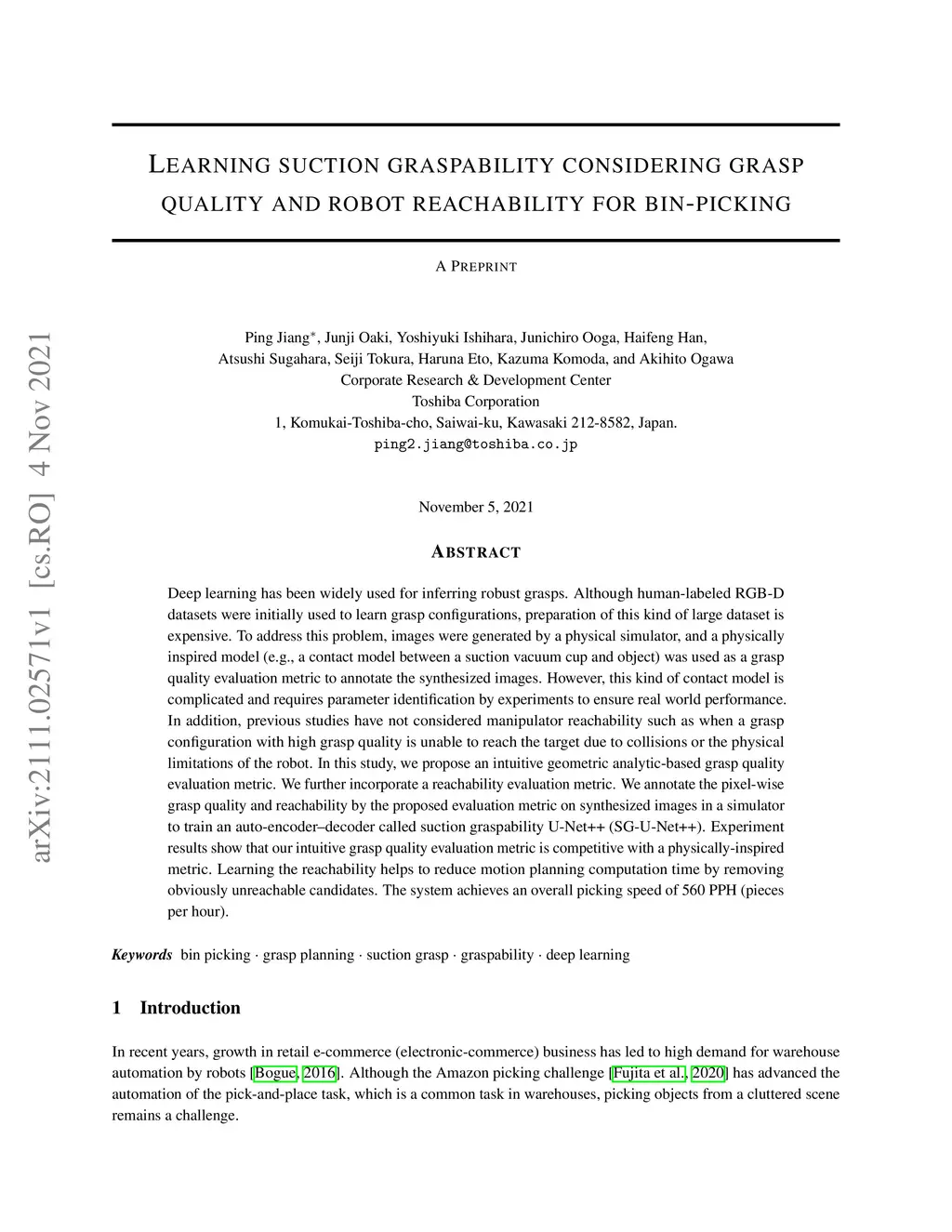 Deep learning has been widely used for inferring robust grasps. Although human-labeled RGB-D datasets were initially used to learn grasp configurations, preparation of this kind of large dataset is expensive. To address this problem, images were generated by a physical simulator, and a physically inspired model (e.g., a contact model between a suction vacuum cup and object) was used as a grasp quality evaluation metric to annotate the synthesized images. However, this kind of contact model is complicated and requires parameter identification by experiments to ensure real world performance. In addition, previous studies have not considered manipulator reachability such as when a grasp configuration with high grasp quality is unable to reach the target due to collisions or the physical limitations of the robot. In this study, we propose an intuitive geometric analytic-based grasp quality evaluation metric. We further incorporate a reachability evaluation metric. We annotate the pixel-wise grasp quality and reachability by the proposed evaluation metric on synthesized images in a simulator to train an auto-encoder--decoder called suction graspability U-Net++ (SG-U-Net++). Experiment results show that our intuitive grasp quality evaluation metric is competitive with a physically-inspired metric. Learning the reachability helps to reduce motion planning computation time by removing obviously unreachable candidates. The system achieves an overall picking speed of 560 PPH (pieces per hour).