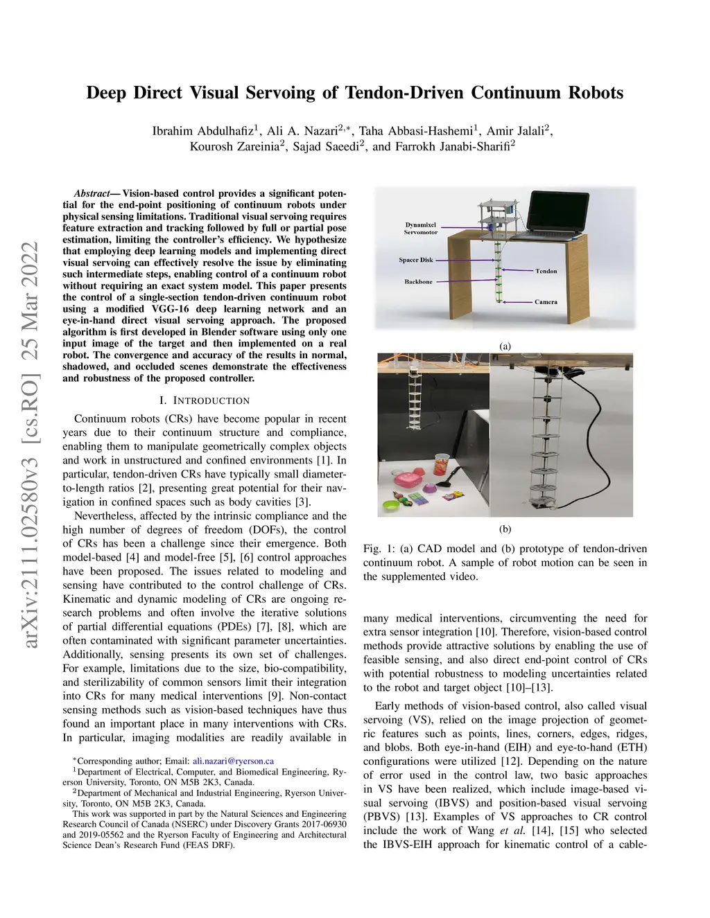 Vision-based control provides a significant potential for the end-point positioning of continuum robots under physical sensing limitations. Traditional visual servoing requires feature extraction and tracking followed by full or partial pose estimation, limiting the controller's efficiency. We hypothesize that employing deep learning models and implementing direct visual servoing can effectively resolve the issue by eliminating such intermediate steps, enabling control of a continuum robot without requiring an exact system model. This paper presents the control of a single-section tendon-driven continuum robot using a modified VGG-16 deep learning network and an eye-in-hand direct visual servoing approach. The proposed algorithm is first developed in Blender software using only one input image of the target and then implemented on a real robot. The convergence and accuracy of the results in normal, shadowed, and occluded scenes demonstrate the effectiveness and robustness of the proposed controller.