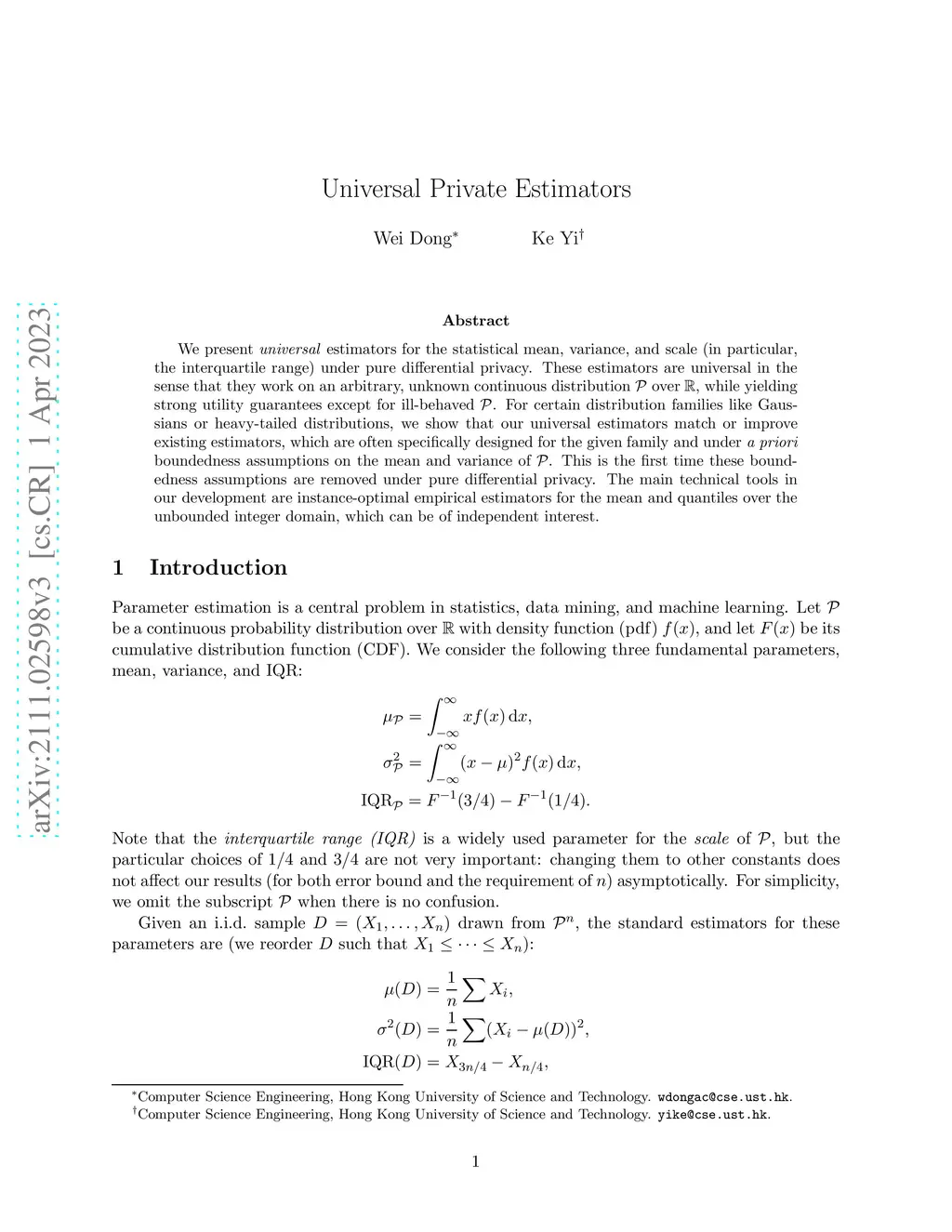We present \textit{universal} estimators for the statistical mean, variance, and scale (in particular, the interquartile range) under pure differential privacy. These estimators are universal in the sense that they work on an arbitrary, unknown continuous distribution over , while yielding strong utility guarantees except for ill-behaved . For certain distribution families like Gaussians or heavy-tailed distributions, we show that our universal estimators match or improve existing estimators, which are often specifically designed for the given family and under \textit{a priori} boundedness assumptions on the mean and variance of . This is the first time these boundedness assumptions are removed under pure differential privacy. The main technical tools in our development are instance-optimal empirical estimators for the mean and quantiles over the unbounded integer domain, which can be of independent interest.