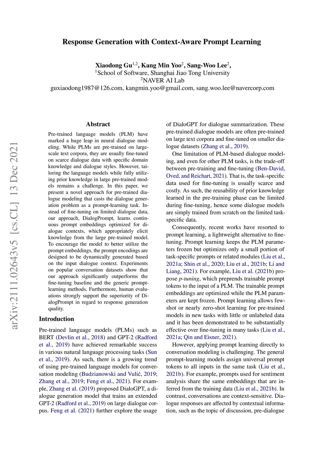 Pre-trained language models (PLM) have marked a huge leap in neural dialogue modeling. While PLMs are pre-trained on large-scale text corpora, they are usually fine-tuned on scarce dialogue data with specific domain knowledge and dialogue styles. However, tailoring the language models while fully utilizing prior knowledge in large pre-trained models remains a challenge. In this paper, we present a novel approach for pre-trained dialogue modeling that casts the dialogue generation problem as a prompt-learning task. Instead of fine-tuning on limited dialogue data, our approach, DialogPrompt, learns continuous prompt embeddings optimized for dialogue contexts, which appropriately elicit knowledge from the large pre-trained model. To encourage the model to better utilize the prompt embeddings, the prompt encoders are designed to be dynamically generated based on the dialogue context. Experiments on popular conversation datasets show that our approach significantly outperforms the fine-tuning baseline and the generic prompt-learning methods. Furthermore, human evaluations strongly support the superiority of DialogPrompt in regard to response generation quality.