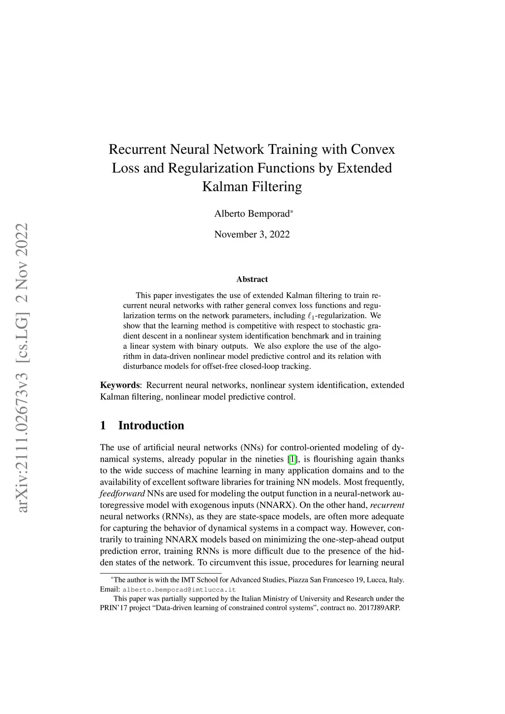This paper investigates the use of extended Kalman filtering to train recurrent neural networks with rather general convex loss functions and regularization terms on the network parameters, including -regularization. We show that the learning method outperforms stochastic gradient descent in a nonlinear system identification benchmark and in training a linear system with binary outputs. We also explore the use of the algorithm in data-driven nonlinear model predictive control and its relation with disturbance models for offset-free closed-loop tracking.