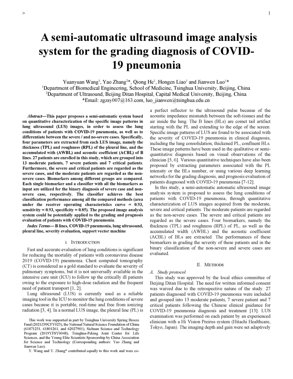 This paper proposes a semi-automatic system based on quantitative characterization of the specific image patterns in lung ultrasound (LUS) images, in order to assess the lung conditions of patients with COVID-19 pneumonia, as well as to differentiate between the severe / and no-severe cases. Specifically, four parameters are extracted from each LUS image, namely the thickness (TPL) and roughness (RPL) of the pleural line, and the accumulated with (AWBL) and acoustic coefficient (ACBL) of B lines. 27 patients are enrolled in this study, which are grouped into 13 moderate patients, 7 severe patients and 7 critical patients. Furthermore, the severe and critical patients are regarded as the severe cases, and the moderate patients are regarded as the non-severe cases. Biomarkers among different groups are compared. Each single biomarker and a classifier with all the biomarkers as input are utilized for the binary diagnosis of severe case and non-severe case, respectively. The classifier achieves the best classification performance among all the compared methods (area under the receiver operating characteristics curve = 0.93, sensitivity = 0.93, specificity = 0.85). The proposed image analysis system could be potentially applied to the grading and prognosis evaluation of patients with COVID-19 pneumonia.