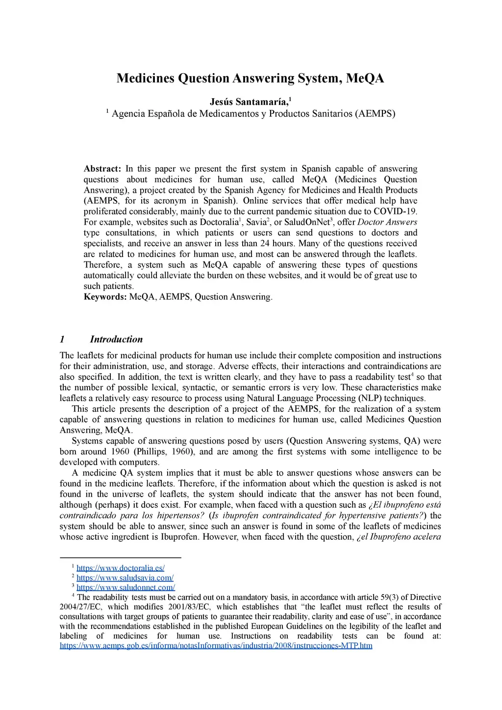 In this paper we present the first system in Spanish capable of answering questions about medicines for human use, called MeQA (Medicines Question Answering), a project created by the Spanish Agency for Medicines and Health Products (AEMPS, for its acronym in Spanish). Online services that offer medical help have proliferated considerably, mainly due to the current pandemic situation due to COVID-19. For example, websites such as Doctoralia, Savia, or SaludOnNet, offer Doctor Answers type consultations, in which patients or users can send questions to doctors and specialists, and receive an answer in less than 24 hours. Many of the questions received are related to medicines for human use, and most can be answered through the leaflets. Therefore, a system such as MeQA capable of answering these types of questions automatically could alleviate the burden on these websites, and it would be of great use to such patients.