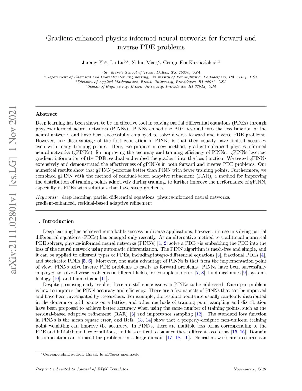 Deep learning has been shown to be an effective tool in solving partial differential equations (PDEs) through physics-informed neural networks (PINNs). PINNs embed the PDE residual into the loss function of the neural network, and have been successfully employed to solve diverse forward and inverse PDE problems. However, one disadvantage of the first generation of PINNs is that they usually have limited accuracy even with many training points. Here, we propose a new method, gradient-enhanced physics-informed neural networks (gPINNs), for improving the accuracy and training efficiency of PINNs. gPINNs leverage gradient information of the PDE residual and embed the gradient into the loss function. We tested gPINNs extensively and demonstrated the effectiveness of gPINNs in both forward and inverse PDE problems. Our numerical results show that gPINN performs better than PINN with fewer training points. Furthermore, we combined gPINN with the method of residual-based adaptive refinement (RAR), a method for improving the distribution of training points adaptively during training, to further improve the performance of gPINN, especially in PDEs with solutions that have steep gradients.