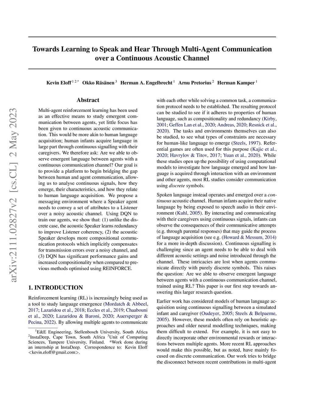 Multi-agent reinforcement learning has been used as an effective means to study emergent communication between agents, yet little focus has been given to continuous acoustic communication. This would be more akin to human language acquisition; human infants acquire language in large part through continuous signalling with their caregivers. We therefore ask: Are we able to observe emergent language between agents with a continuous communication channel? Our goal is to provide a platform to begin bridging the gap between human and agent communication, allowing us to analyse continuous signals, how they emerge, their characteristics, and how they relate to human language acquisition. We propose a messaging environment where a Speaker agent needs to convey a set of attributes to a Listener over a noisy acoustic channel. Using DQN to train our agents, we show that: (1) unlike the discrete case, the acoustic Speaker learns redundancy to improve Listener coherency, (2) the acoustic Speaker develops more compositional communication protocols which implicitly compensates for transmission errors over a noisy channel, and (3) DQN has significant performance gains and increased compositionality when compared to previous methods optimised using REINFORCE.