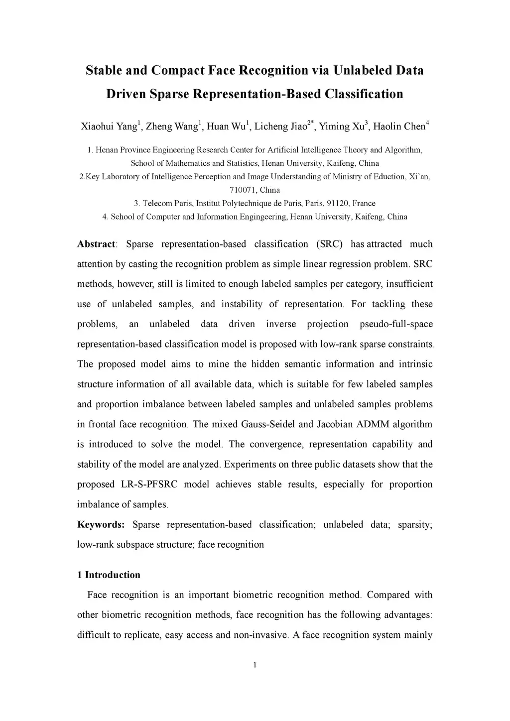 Sparse representation-based classification (SRC) has attracted much attention by casting the recognition problem as simple linear regression problem. SRC methods, however, still is limited to enough labeled samples per category, insufficient use of unlabeled samples, and instability of representation. For tackling these problems, an unlabeled data driven inverse projection pseudo-full-space representation-based classification model is proposed with low-rank sparse constraints. The proposed model aims to mine the hidden semantic information and intrinsic structure information of all available data, which is suitable for few labeled samples and proportion imbalance between labeled samples and unlabeled samples problems in frontal face recognition. The mixed Gauss-Seidel and Jacobian ADMM algorithm is introduced to solve the model. The convergence, representation capability and stability of the model are analyzed. Experiments on three public datasets show that the proposed LR-S-PFSRC model achieves stable results, especially for proportion imbalance of samples.