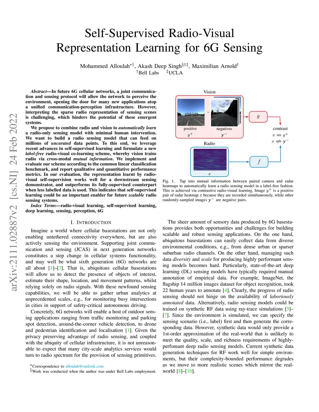 In future 6G cellular networks, a joint communication and sensing protocol will allow the network to perceive the environment, opening the door for many new applications atop a unified communication-perception infrastructure. However, interpreting the sparse radio representation of sensing scenes is challenging, which hinders the potential of these emergent systems. We propose to combine radio and vision to automatically learn a radio-only sensing model with minimal human intervention. We want to build a radio sensing model that can feed on millions of uncurated data points. To this end, we leverage recent advances in self-supervised learning and formulate a new label-free radio-visual co-learning scheme, whereby vision trains radio via cross-modal mutual information. We implement and evaluate our scheme according to the common linear classification benchmark, and report qualitative and quantitative performance metrics. In our evaluation, the representation learnt by radio-visual self-supervision works well for a downstream sensing demonstrator, and outperforms its fully-supervised counterpart when less labelled data is used. This indicates that self-supervised learning could be an important enabler for future scalable radio sensing systems.